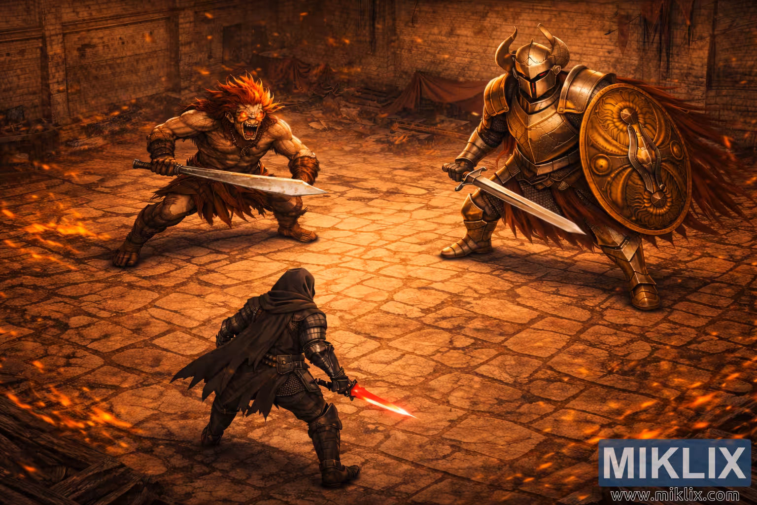 Аниме фан арт високе резолуције који приказује Потамњелог окренутог према Незаконтом ратнику и Витезу Крусиблу са мачем и штитом у рушевинама дворишта замка Редмејн, гледано из уздигнутог изометријског угла.