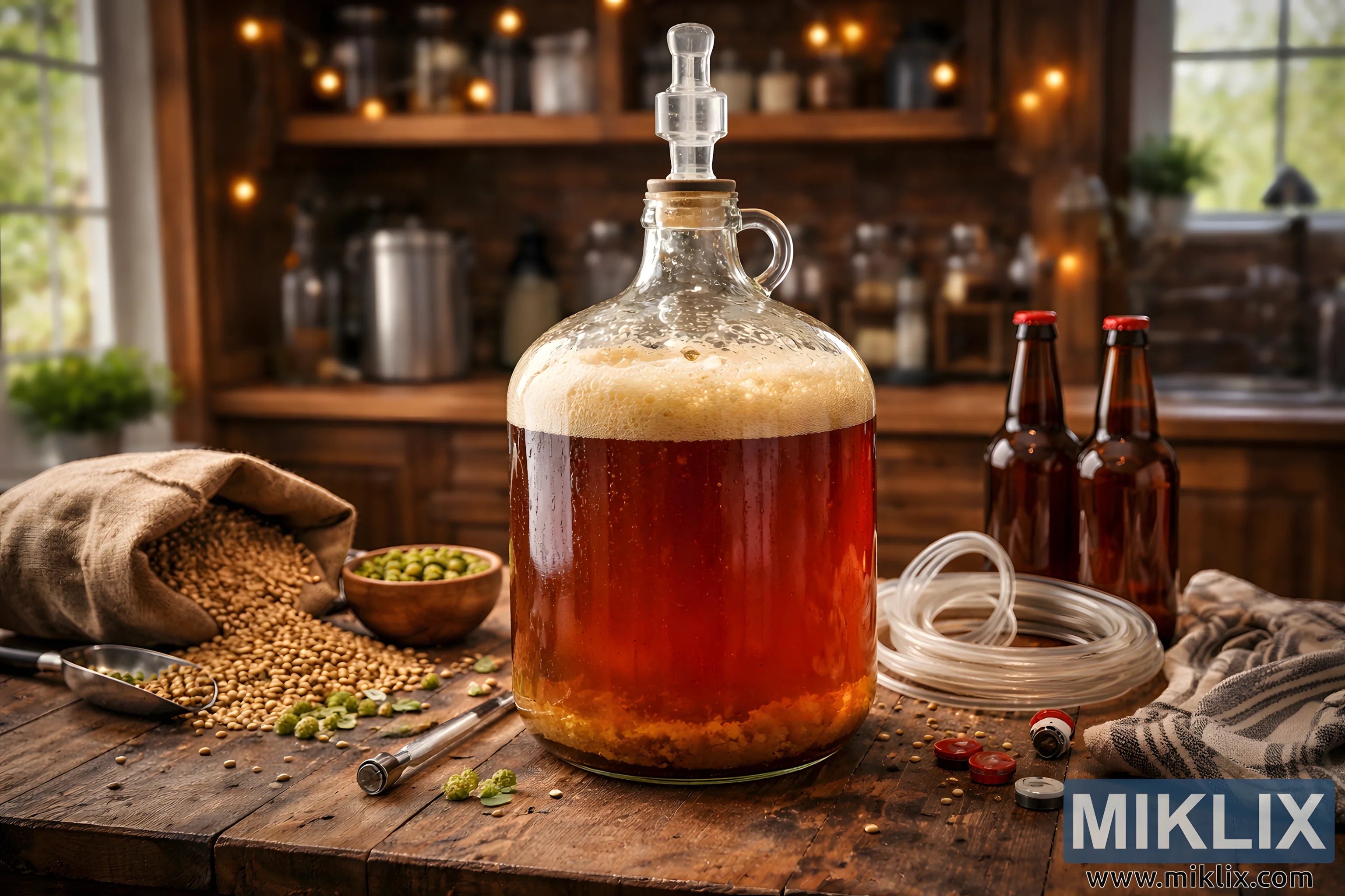 Око ферментатора налази се пажљиво компонована мртва природа састојака и алата за домаће пиво. Са леве стране, врећа од јуте просипа бледа зрна јечменог слада по столу, нека сакупљена у металној кашичици чија полирана површина одражава ћилибарну нијансу пива. Мала дрвена чинија садржи јарко зелене пелете хмеља, чија боја пружа свеж контраст топлим смеђим и златним нијансама сцене. Термометар од нерђајућег челика постављен је дијагонално на површину стола, наговештавајући прецизност и стрпљење потребне за кување пива. Са десне стране, неколико смеђих стаклених пивских флаша стоји усправно са црвеним чеповима у близини, праћено спиралним провидним цевима и неколико лабавих чепова за флаше, као да је дан флаширања пред вратима.