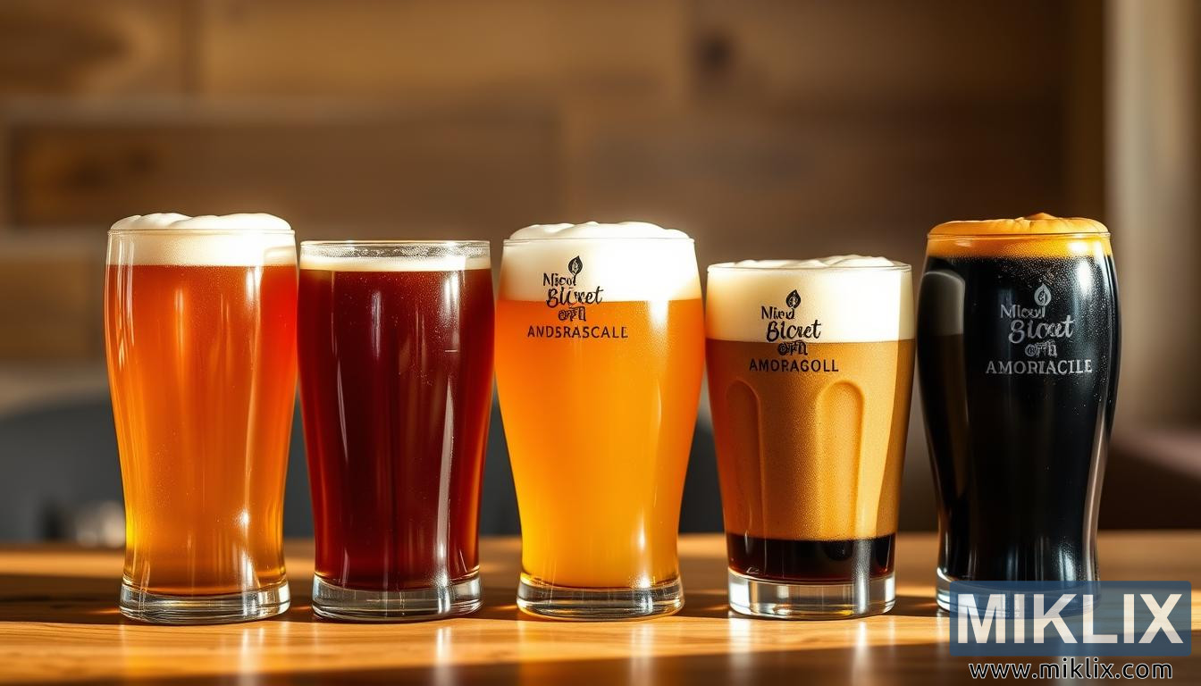Топло осветљен избор различитих стилова пива, од ћилибарног ејла до стаута, од којих свако приказује јединствене укусе бисквитног слада и привлачне текстуре.