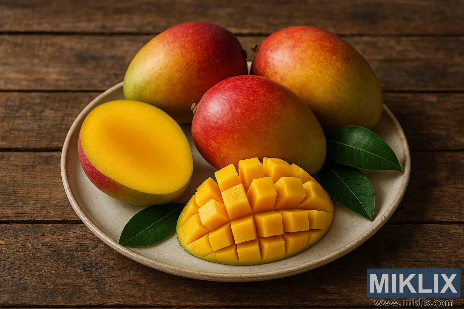 Слика високе резолуције свежих манга поређаних на керамичком тањиру на рустичном дрвеном столу, са целим и исеченим воћем, природним осветљењем и ботаничким детаљима.