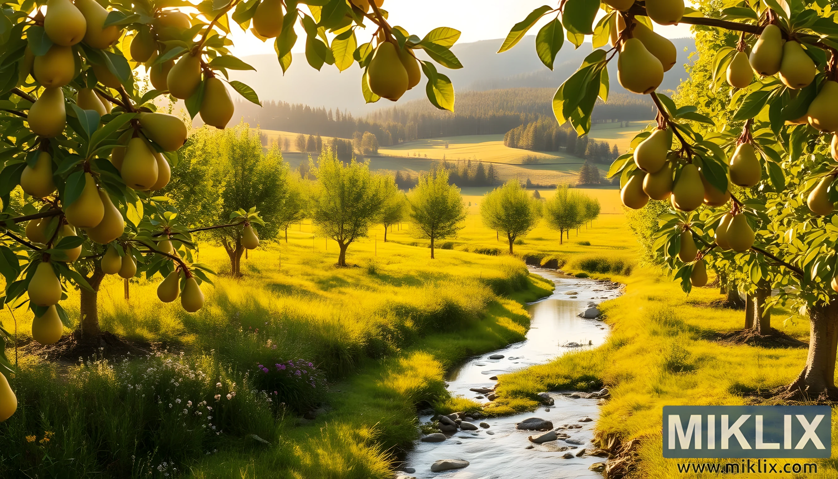 Златно осветљен воћњак крушака са зрелим плодовима, потоком и валовитим брдима, који приказује хармонију са природом и еколошке предности одрживе производње.