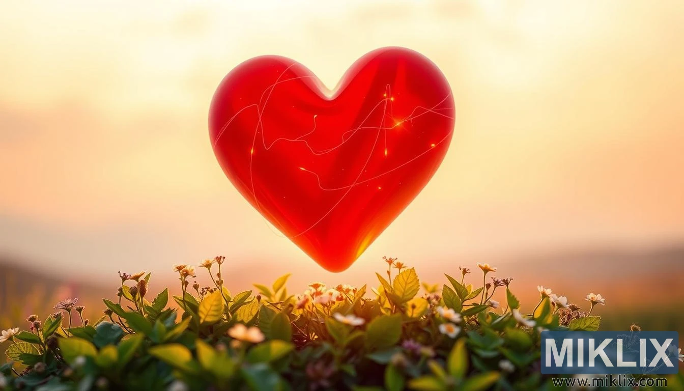 У суштини, сцена постаје визуелна медитација о виталности и хармонији. Блиставо срце које лебди изнад цвећа је и буквално и метафорично – симбол биолошке снаге и емоционалне отпорности, уздигнуте даровима природног света. Топла златна атмосфера, бујно зеленило и постојани гримизни сјај заједно стварају поруку наде: да кроз свесну исхрану и равнотежу, здравље срца може природно да цвета, постајући не само питање преживљавања, већ блистав израз живота проживљеног пуним плућима и добро.