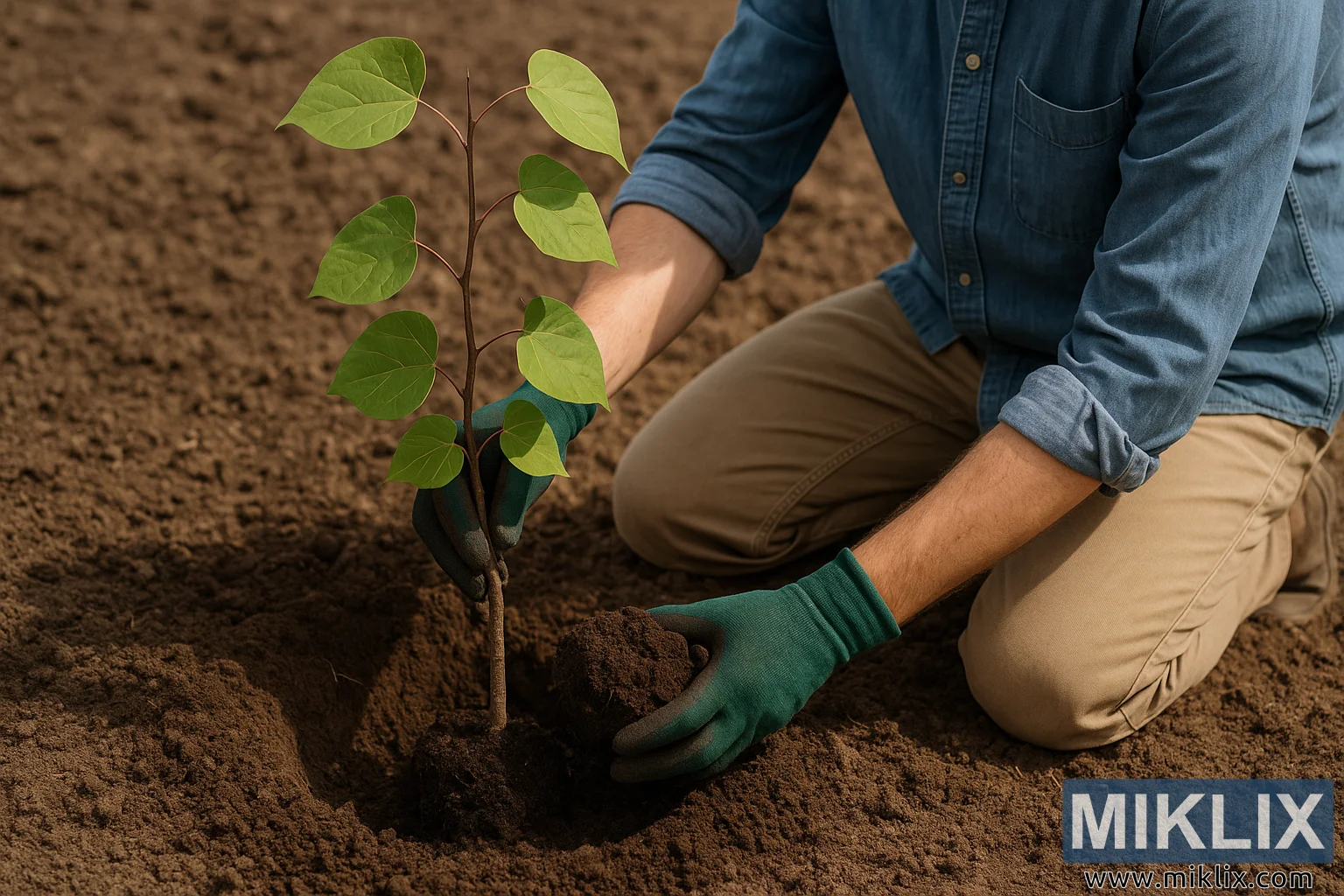 Krupni plan pejzaž fotografija osobe koja sadi mlado drvo crvenog pupoljka u sveže pripremljenom zemljištu, pokazujući pažljive ruke, zeleno lišće i toplu prirodnu svetlost.
