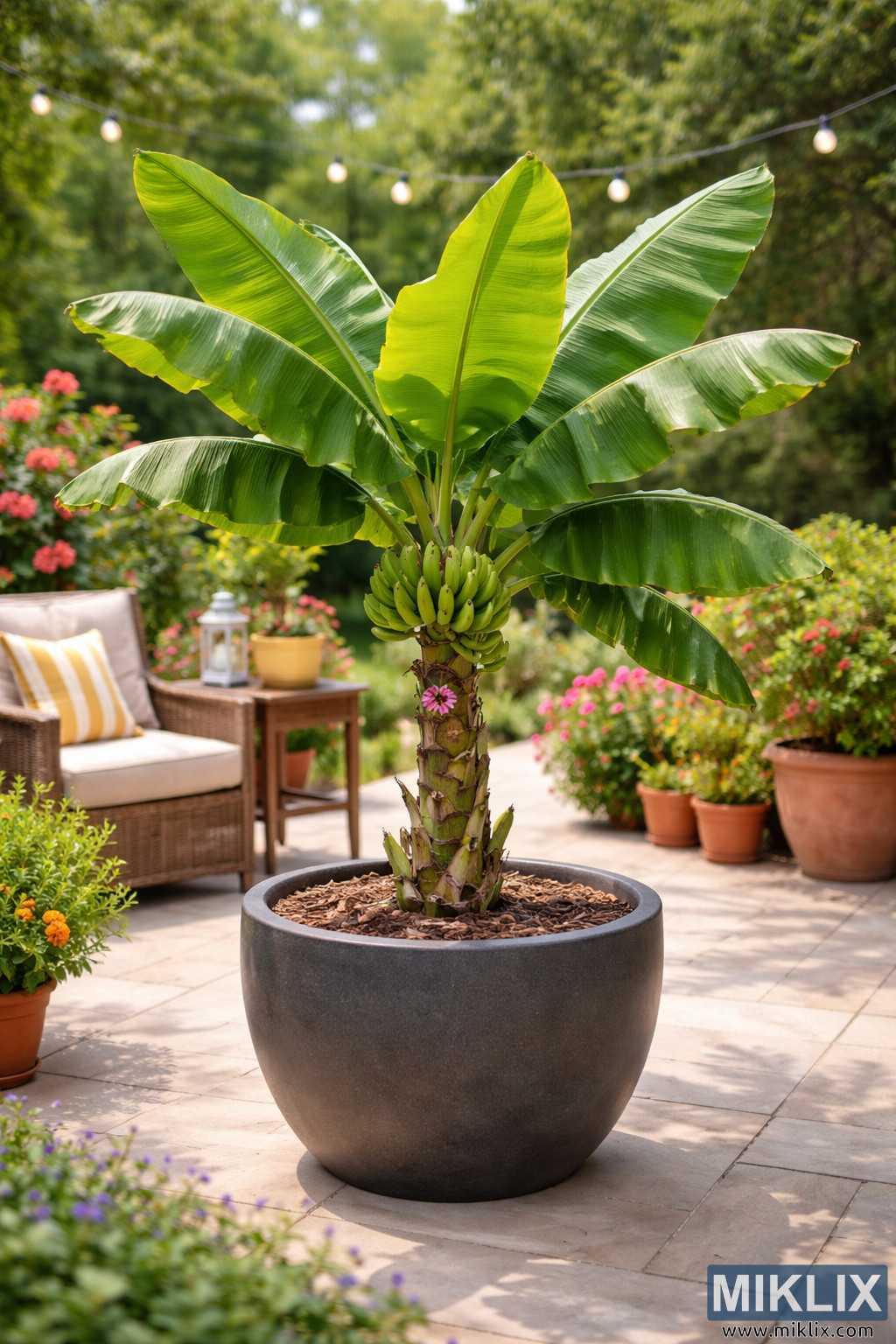 Slika predstavlja osunčanu scenu u dvorištu usredsređenu na zdravu patuljastu biljku banane Cavendish koja raste u velikom, okruglom, tamno sivom kontejneru. Biljka stoji uspravno i kompaktno, karakteristično za patuljaste sorte, sa čvrstim pseudostabljikom koje izlazi iz bogatog, malčiranog tla. Njegovi široki, sjajni zeleni listovi ventilator spolja simetrično, neki savijaju nežno, a drugi stoje više uspravno, hvatanje svetlost i otkriva suptilne rebra i prirodnu teksturu duž lisnih vena. Blizu vrha pseudostema, vidljiva je mala grupa nezrelih banana, čvrsto upakovanih i svetlo zelene, što ukazuje na aktivno plodnu biljku. Odmah ispod voćnog klastera, mali ljubičasti cvet banane dodaje kontrastni naglasak boje i botaničkog interesa. Kontejner se nalazi na popločanom dvorištu sastavljenom od lakih kamenih pločica postavljenih u uredan, uredan obrazac, odražavajući toplu dnevnu svetlost i ojačavajući otvoreni, domaći ambijent. Oko biljke banane nalaze se dodatne biljke u saksiji i cvetne posude u terakoti i neutralnim tonovima, ispunjene šarenim cvetovima i zelenim lišćem koje uokviruju centralni predmet bez preplavljivanja. Sa leve strane, pletenog pruća stilu terasa stolica sa mekim jastucima sugeriše udoban prostor za sjedenje, u pratnji malog bočnog stola koji drži dekorativni fenjer, pojačavajući ideju opuštenog, živeo u otvorenom prostoru. U pozadini, bujno zelenilo i drveće stvaraju blago zamagljenu pozadinu, pružajući dubinu i osećaj privatnosti, naglašavajući biljku banane kao žarišnu tačku. Pramen toplih belih svetla visi iznad glave, suptilno vidljiv u odnosu na zelenilo i doprinosi privlačnoj atmosferi vrta kod kuće. Ukupna kompozicija se oseća uravnoteženo i mirno, kombinujući ukrasno baštovanstvo sa praktičnim uzgojem kontejnera. Osvetljenje je prirodno i ravnomerno, sa nežnim naglascima na listovima i mekim senkama na površini dvorišta, što ukazuje na prijatan dan pogodan za uživanje na otvorenom. Slika prenosi osećaj uspešnog baštovanstva kontejnera, tropskog ambijenta i života na terasi, ilustrujući kako biljka banane Dwarf Cavendish može napredovati i kao produktivan i dekorativni element u stambenom okruženju na otvorenom.