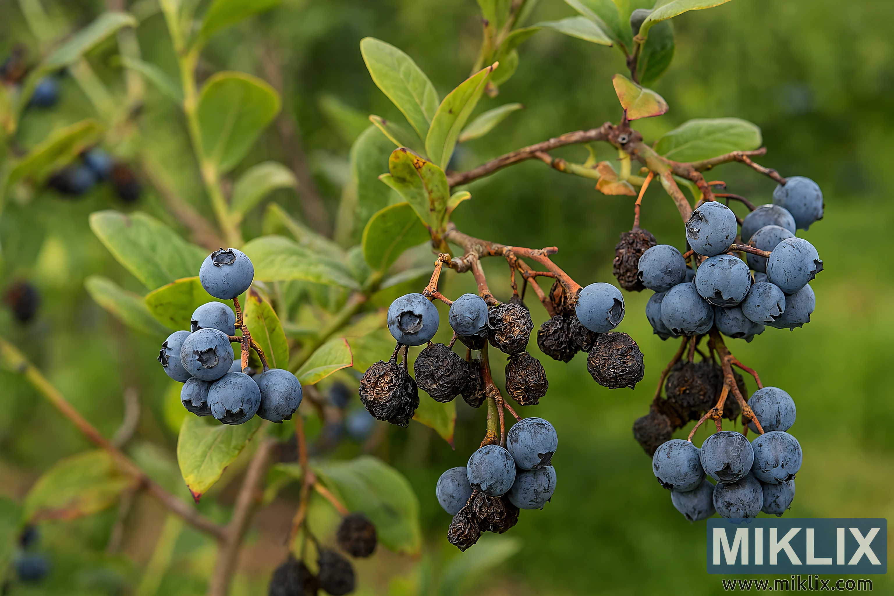 Ova pejzažna slika visoke rezolucije snima krupni pogled na grm borovnice pogođen bolešću bobičastog voća mumije. Grm je postavljen u prirodnom vrtnom okruženju sa blago zamagljenom zelenom pozadinom, stvarajući osećaj dubine i spokoja. U prvom planu je prikazano nekoliko grozdova borovnica koje vise sa vitkih, crvenkasto-smeđih stabljika. Među zdravim bobicama - debelim, okruglim i tamno plavim sa karakterističnim prašnjavim cvetom - nalaze se brojne smežurane, tamno smeđe do crne bobice koje pokazuju znakove bolesti mumija bobica. Ovi zaraženi plodovi izgledaju suvo, naborano i nepravilnog oblika, nalik grožđu ili mumificiranim ostacima.