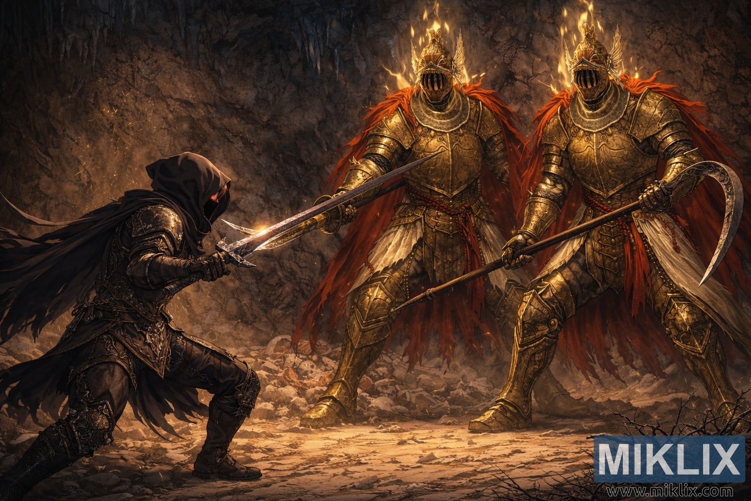 Slika predstavlja dramatičnu interpretaciju bitke u anime stilu duboko u napuštenoj pećini Elden Ringa. Pećina se proteže široko u pejzažnoj kompoziciji, njen plafon je nazubljen tamnim stalaktitima koji blede u senci. Tlo je prepuno napuknutih kostiju, slomljenih lobanja i bledih fragmenata oklopa, što ukazuje na bezbroj Tarnished i ratnika koji su pali ranije. Topla svetlost nalik žaru reflektuje se od vlažnih kamenih zidova, ispunjavajući podzemnu komoru maglovitim sjajem koji je u kontrastu sa opresivnom tamom na ivicama scene.