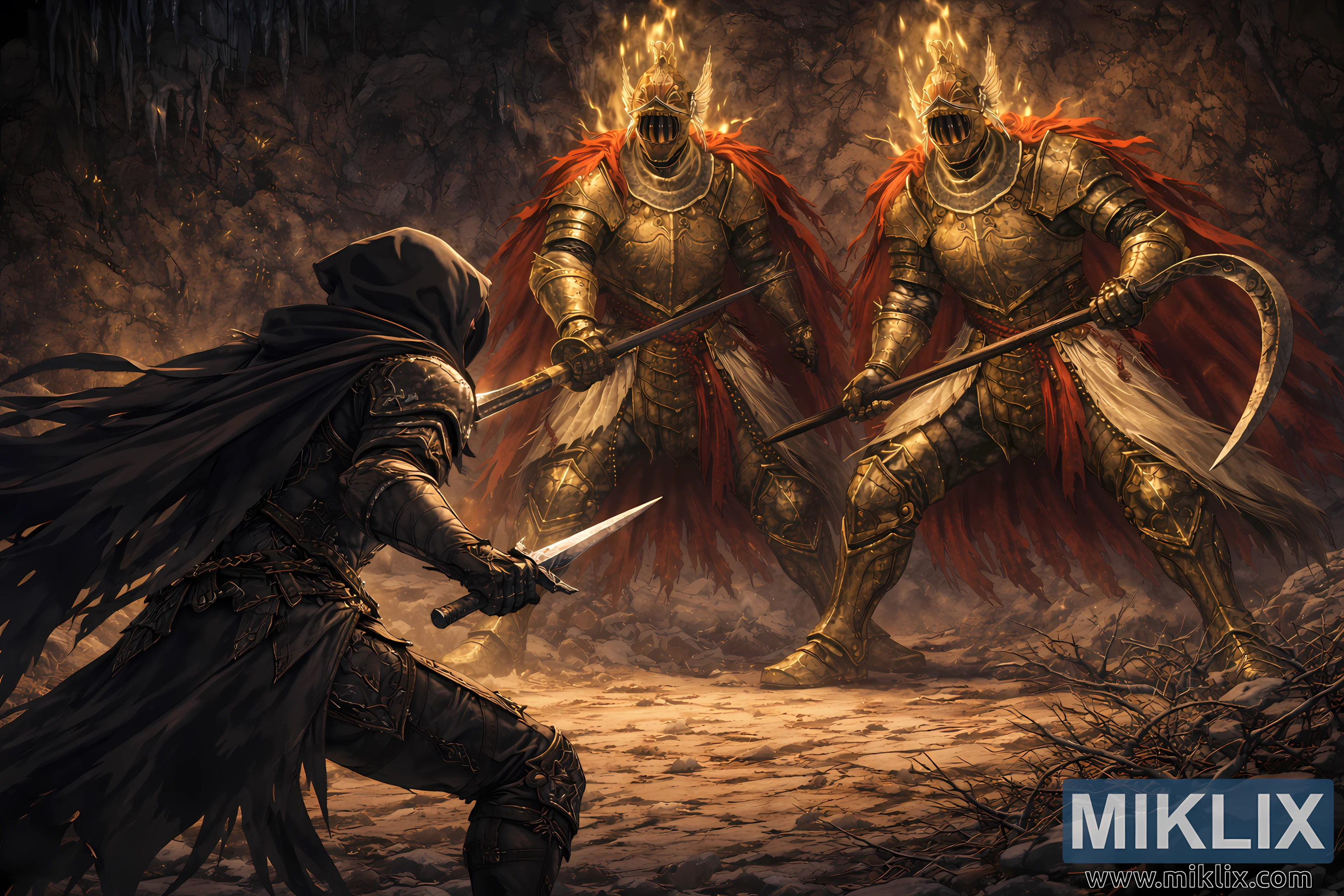 Zajedno, identična veličina i držanje dva Cleanrot vitezova stvaraju osećaj neodoljive simetrije i neizbežnosti, dok usamljeni Tarnished, gledano s leđa, utjelovljuje prkos protiv nemogućih šansi. Osvetljenje, kompozicija i perspektiva kombinuju se da zamrznu jedan otkucaj srca pre nego što nasilje izbije, trenutak sumorne odlučnosti duboko u trulim dubinama Napuštene pećine.