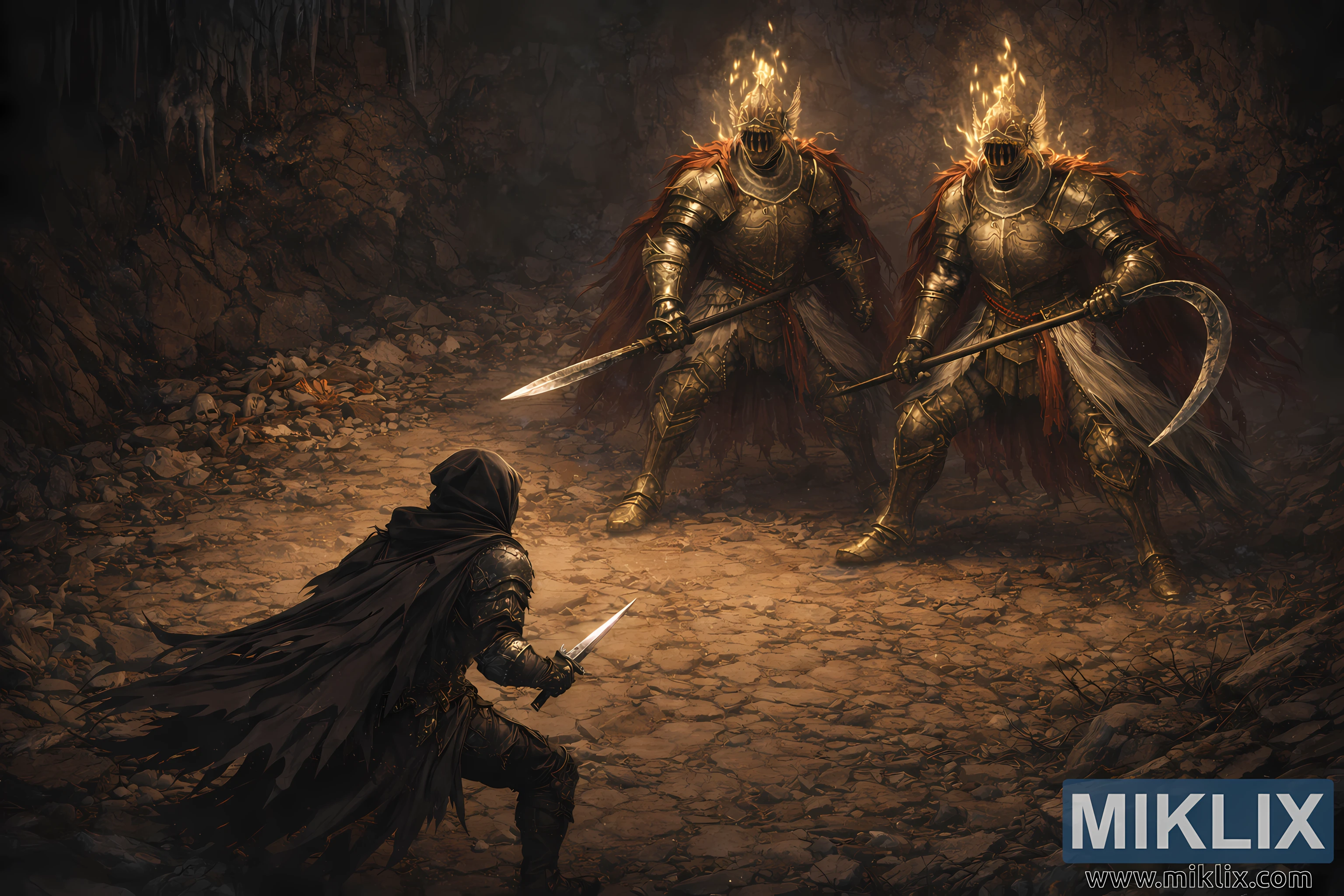 Preko čistine stoje dva Cleanrot vitezova, identične visine i građe, nadvija se nad scenom kao blizanci stražari. Njihov zlatni oklop je težak i potamnio, nekada ukrašene gravure sada omekšane korozijom i truležom. Obe kacige slabo gore, plamen im je više prigušen nego stilizovan, bacajući bolesni, neujednačen sjaj kroz proreze vizira. Svetlost treperi na stenskim zidovima i izlije se na zemlju, otkrivajući obim propadanja oko njih. Svaki vitez nosi poderani crveni ogrtač koji visi u neravnim trakama, obojen tamnim vremenom i prljavštinom, a ne herojskim sjajem.