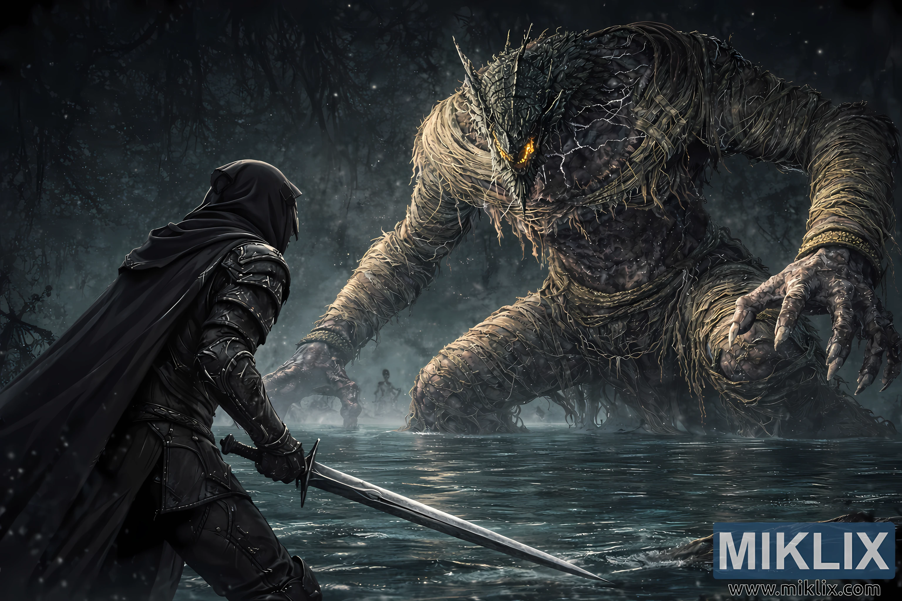 Dominira desnom stranom kadra Dragonkin Soldier of Nokstella, kolosalan i neodoljiv u razmeri. Stvorenje se uzdiže iz reke na ogromnim, savijenim nogama, a njegov pogrbljeni torzo uzdiže se daleko iznad Potamnjenog. Njegovo telo je čvrsto umotano u bezbroj slojeva drevnih, pohabanih zavoja koji se drže za njegove masivne udove i grudi, od kojih su mnogi pocepani ili opušteni od vlage. Ispod omota se vidi iskvareno meso tamno, prošarano i prošarano slabim lukovima bledih, pucketanja munje koje puze preko njegovog torza i ramena. Zmajeva glava je zmajeva i teško oklopljena grubim kamenim ljuskama, spuštenim prema Potamnjenom u grabežljivom, procenjujućem položaju. Oči mu sijaju prigušenim ćilibarskim svetlom, suzdržanim ali prodornim, prenoseći inteligenciju i pretnju bez preterivanja. Jedna masivna ruka dopire napred, kandžasti prsti delimično uronjeni u vodu, šaljući spore talase preko površine reke.