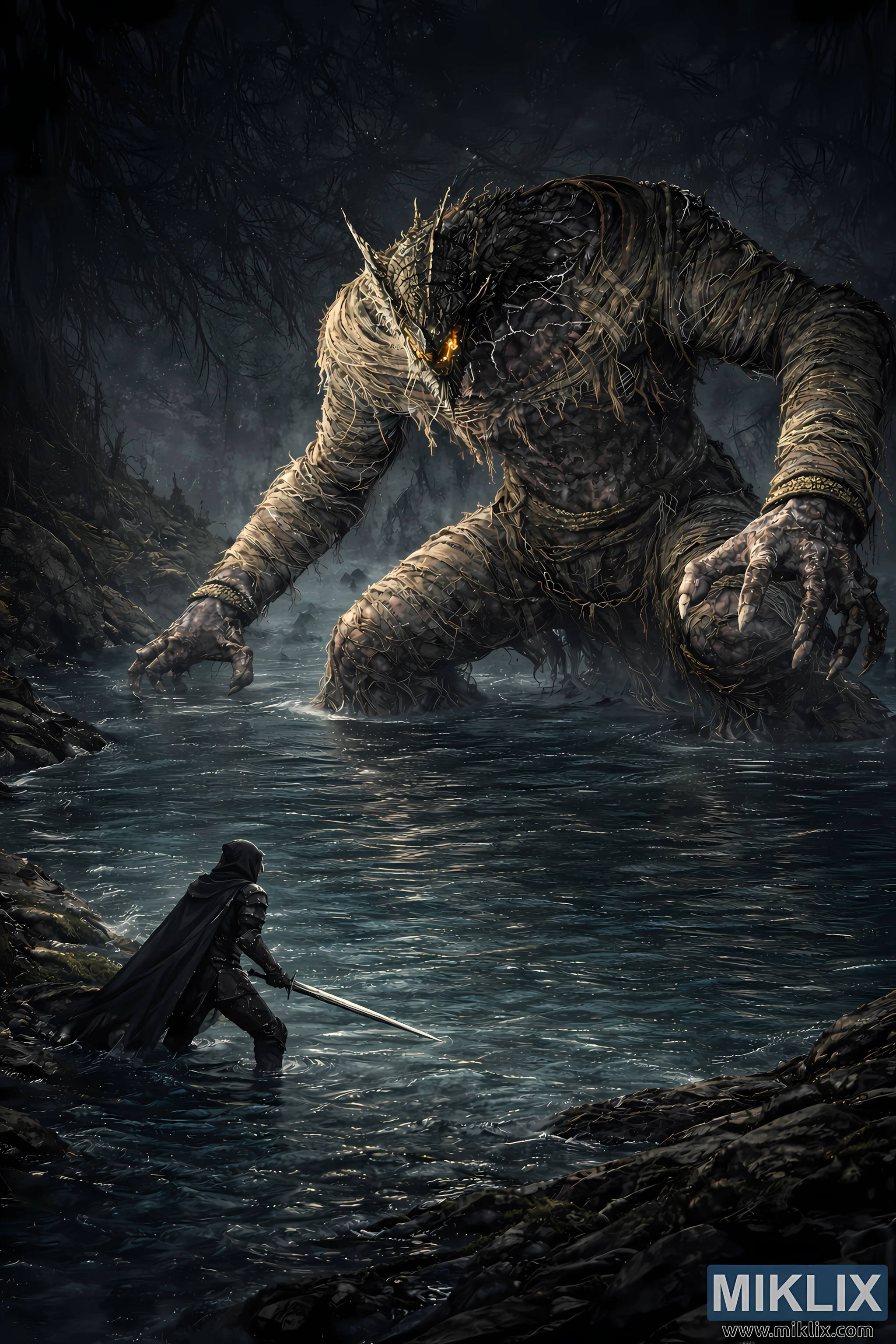 Iznad scene se uzdiže Dragonkin Soldier of Nokstella, prikazan u znatno većem obimu nego ranije, čineći Tarnished izgleda gotovo beznačajnim u poređenju. Dragonkin dominira gornjom polovinom kadra, njegovo kolosalno telo se uzdiže iz reke kao živa ruševina. Sam njegov pogrbljeni torzo je nekoliko puta veći od visine Tarnisheda, dok se njegove masivne ruke protežu prema spolja, svaka ruka dovoljno velika da u potpunosti proguta ratnika. Oblik stvorenja je čvrsto umotan u slojeve drevnih, raspadajućih zavoja koji se spuštaju i trgaju, otkrivajući ogromna prostranstva korumpiranog, prošaranog mesa ispod. Bledi, suzdržani lukovi munje slabo se provlače preko njegovih izloženih grudi i ramena, ukazujući na ogromnu, jedva sadržanu snagu. Njegova drakonska glava, oklopljena grubim, kamenim krljuštima, nazire se daleko iznad Tarnisheda, nagnuta nadole u grabežljivom, osuđujućem pogledu. Prigušena ćilibarska svetlost sija iz njegovih očiju, fokusirana na usamljenog izazivača ispod.