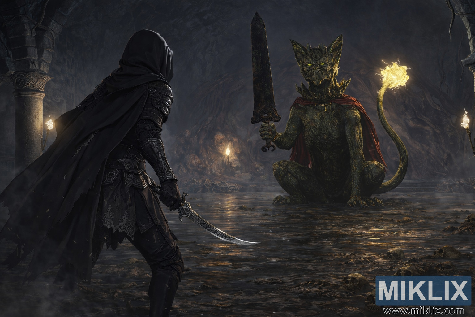 Životna sredina igra ključnu ulogu u atmosferi. Masivni kameni stubovi uzdižu se duž bočnih strana komore, njihove površine su erodirane i urezane drevnim uzorcima. Trepereće baklje postavljene na zidove bacaju toplu narandžastu svetlost koja pleše preko vlažnog kamena, stvarajući promenljive senke koje se protežu prema centru gde su dve figure okrenute jedna prema drugoj. Pod je delimično poplavljen, a talasi u vodi odražavaju svetlost baklje i sjajni rep Čuvara, dodajući svetlucavi sloj dubine i pokreta inače mirnoj konfrontaciji. Razbacane kosti i fragmenti polomljenih zidova počivaju ispod površine vode, suptilno nagoveštavajući prošle bitke i zaboravljene putnike.
