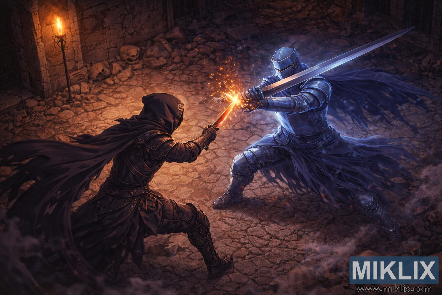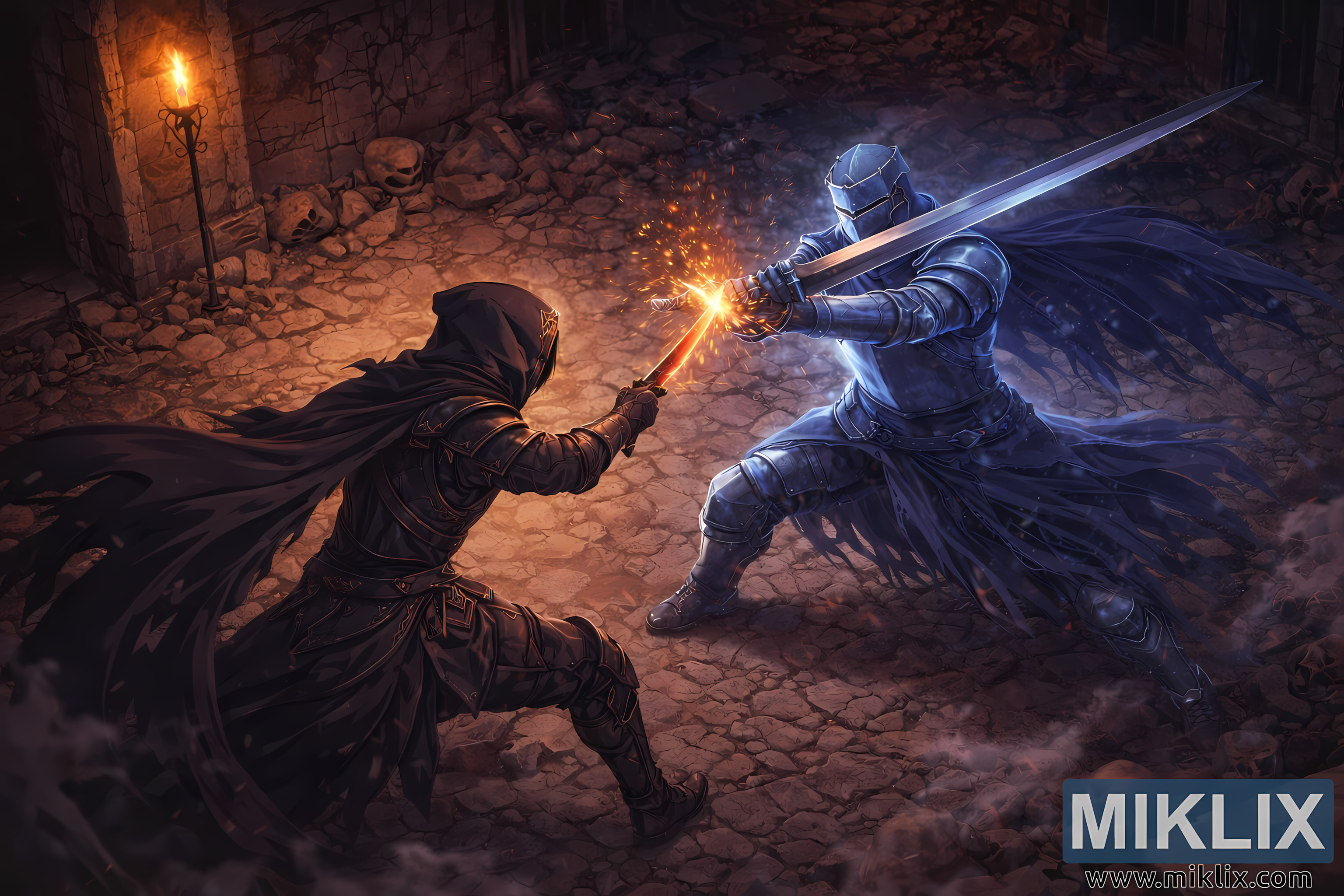 Jedna baklja postavljena na kamenom zidu u gornjem levom uglu baca treperavu ćilibarsku svetlost preko tamnice, slikajući tople detalje preko napuknutog zida i u kontrastu sa ledenim sjajem viteza. Ova interakcija tople baklje, vatrenih varnica i hladne plave aure stvara dramatičnu napetost u boji u srcu slike. Izometrijsko gledište pretvara dvoboj u taktičku sliku, omogućavajući gledaocu da jasno pročita položaje i pokrete boraca, kao da je svedok ključne razmene u dubinama samice.