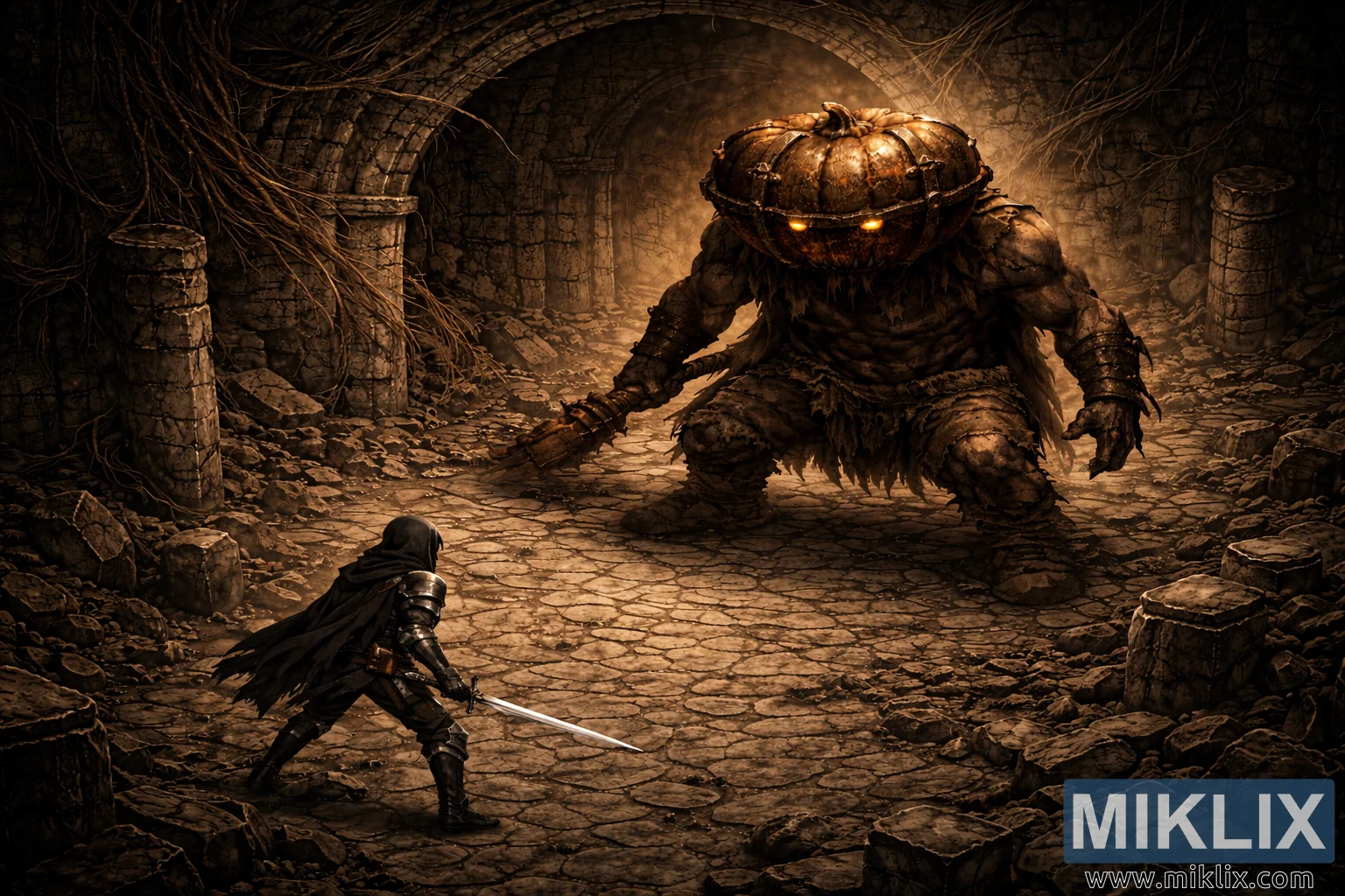Nasuprot Tarnishedu, koji zauzima desnu polovinu pejzažnog okvira, nazire se šef Mad Pumpkin Head u ogromnoj i zastrašujućoj skali. Glavnina stvorenja patuljasti je i heroja i okolne arhitekture, njegova masivna kaciga u obliku bundeve izgleda falsifikovana od starog, korodiranog metala, a ne stilizovanog preterivanja. Pruge rđe, udubljenja i površine bez koštica daju kormilu opipljivu težinu, dok debele gvozdene trake i zakovice vezuju njegovu strukturu zajedno. Uski prorezi za oči sijaju prigušenim žarom nalik narandžastom svetlošću koja seče kroz mrak bez nadjačavanja scene. Ispod kacige, šefov mišićavi torzo je teksturiran prljavštinom, ožiljcima i slojevitom prljavštinom, delimično skriven pocepanom tkaninom i poderanim kožnim trakama koje teško vise sa struka. Jedna ogromna ruka drži sirovu šiljastu palicu čija se težina podrazumeva načinom na koji se utiskuje u kameni pod, dok druga ruka visi otvorena sa napetim, uvijenim prstima između mirnoće i iznenadnog nasilja. Njegov široki stav oseća ukorenjen i nepokretan, kao živi stub koji se uzdiže iz ruševina.