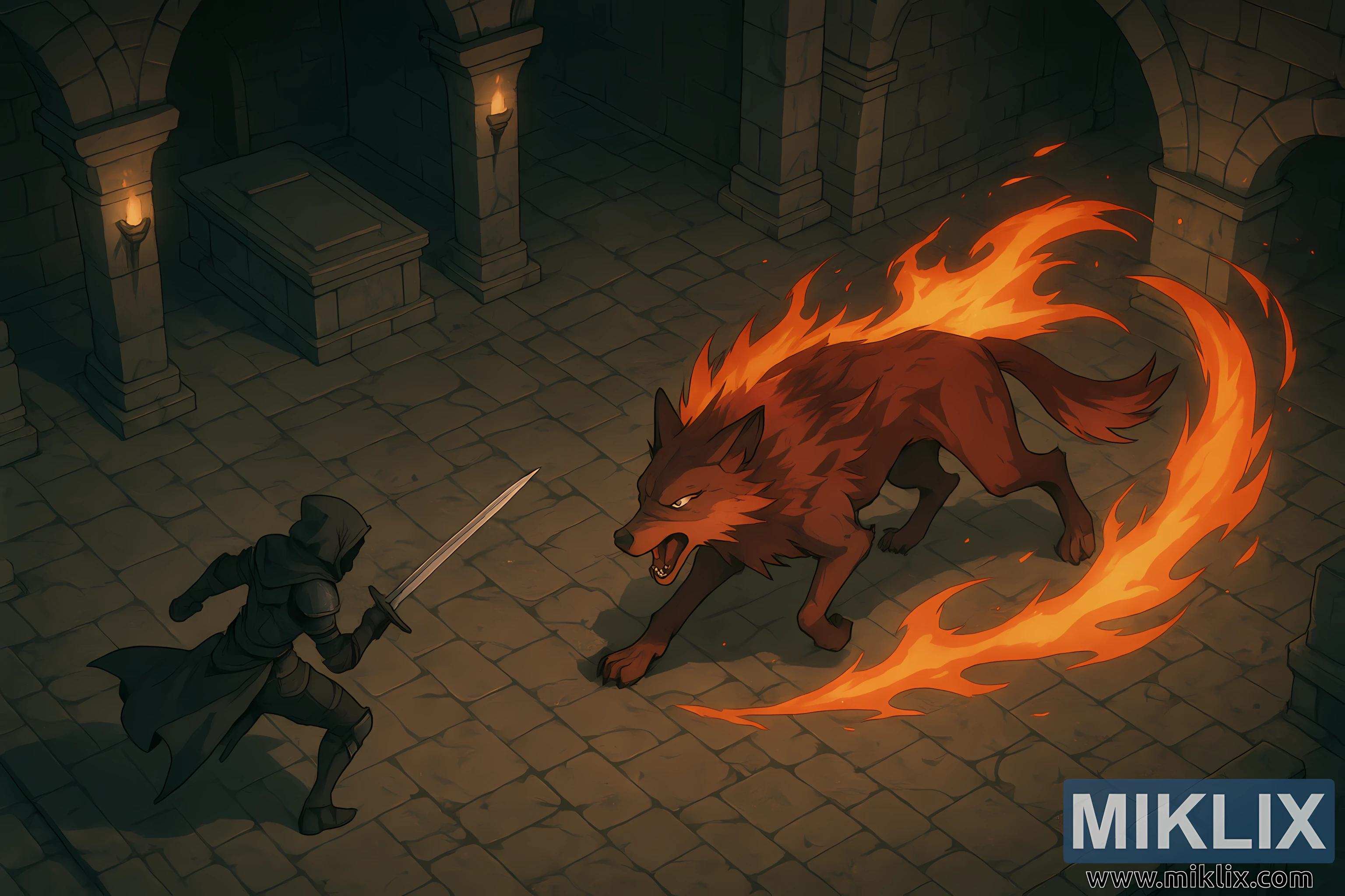 Dominira desnom stranom okvira Crveni vuk šampiona, predstavljen u širokom, prizemljenom stavu dok reži prema približavanju Tarnished. Krzno vuka izgleda gusto i isklesano, sa vatrenom grivom koja izbijaju iz leđa i repa u vrtlozima živopisne narandžaste i svetlucavog žara. Odozgo, ovi plamenovi stvaraju dinamične kružne pokrete - luk oko vučjeg tela poput užarene aure koja osvetljava delove kamena ispod njega. Vučje oči gore neprijateljskom, natprirodnom inteligencijom, a njihov sjaj pojačavaju tamnija udubljenja kripte.