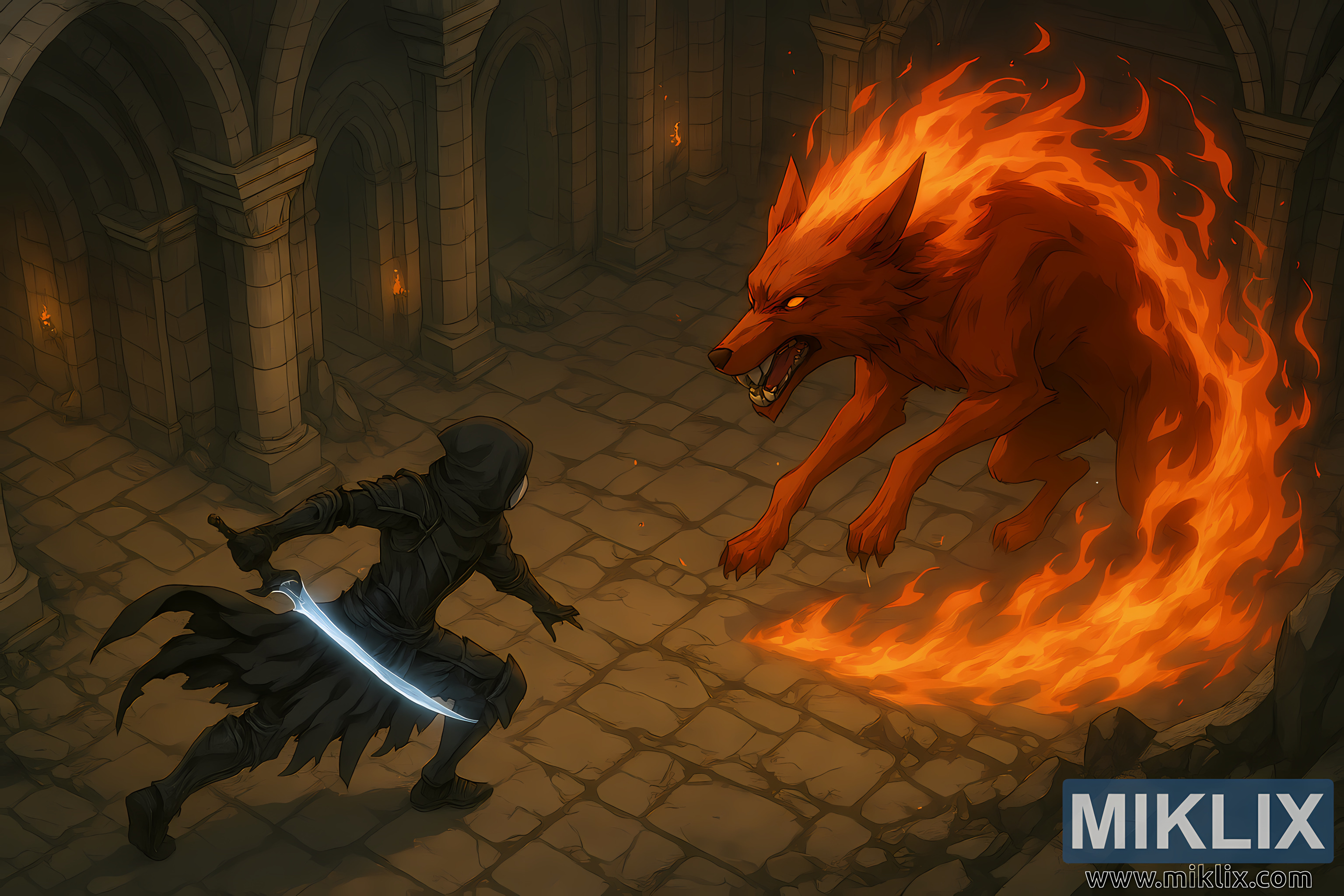 Nasuprot tome, Crveni vuk šampiona juriša napred, njegov masivni oblik zahvaćen je bučnim plamenom. Vukovo crvenkasto-smeđe krzno jedva je vidljivo ispod vatre, koja prelazi iz duboke grimizne u jezgru u jarko narandžastu i žutu na ivicama. Njegove sjajne žute oči su sužene u agresiji, a usta su mu otvorena u režanju, otkrivajući oštre zube. Prednje noge vuka su ispružene usred skoka, kandže gole, dok mu se zadnje noge odguruju od zemlje. Plamen trag iza njega, bacajući dinamičnu svetlost i senku preko kamenog poda i okolne arhitekture.