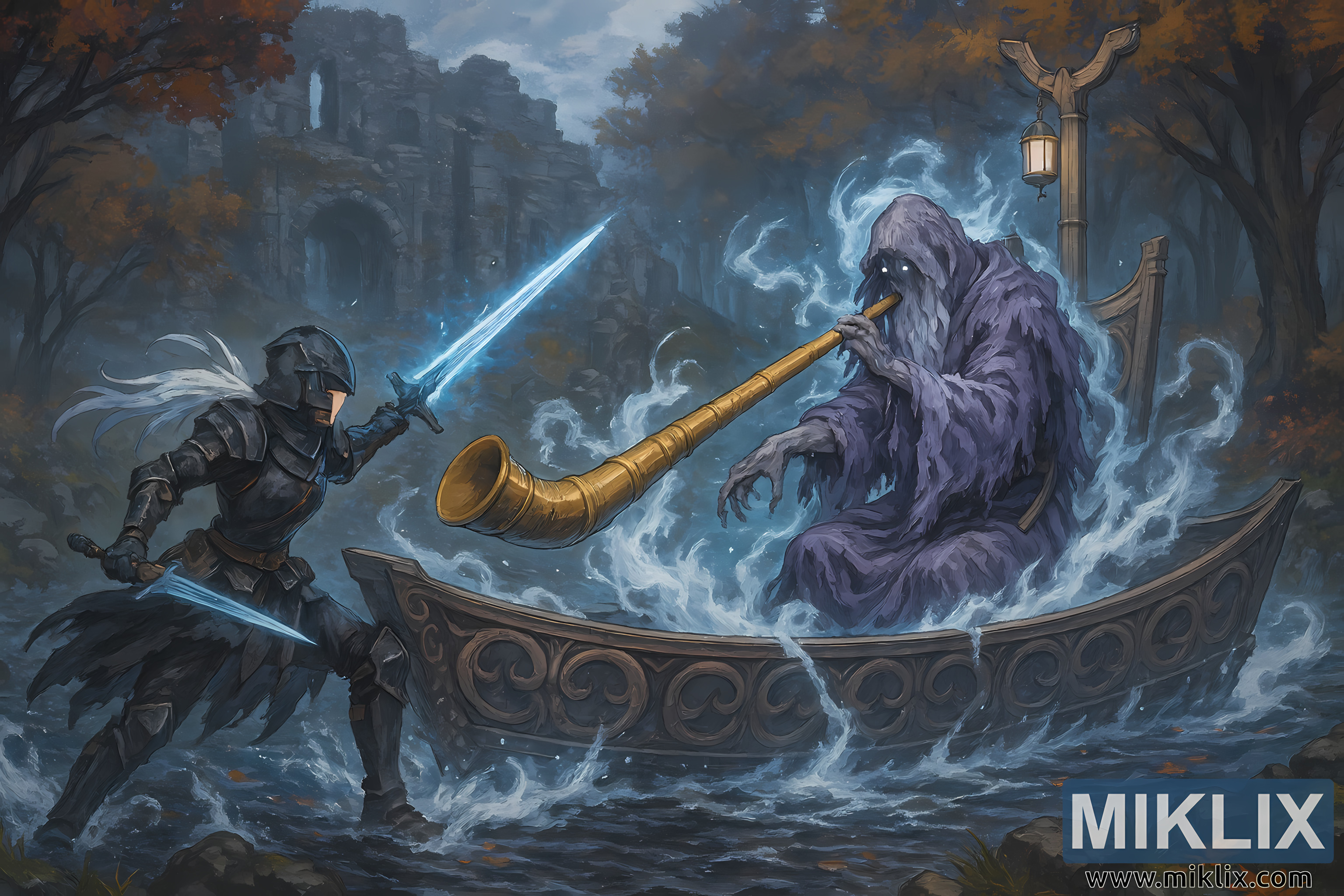 Kompozicija je veoma dinamična, sa dijagonalnim linijama koje formiraju čamac, rog i skok Tarnisheda. Prskanje vode i uskovitlana magla dodaju kretanje i energiju, dok magični efekti poput sjajnih mačeva i spektralnih aura poboljšavaju fantazijski ambijent. Ilustracija kombinuje izražajnu četku, detaljnu linijsku umetnost i teksturiranu boju kako bi stvorila živopisnu i impresivnu scenu bitke.