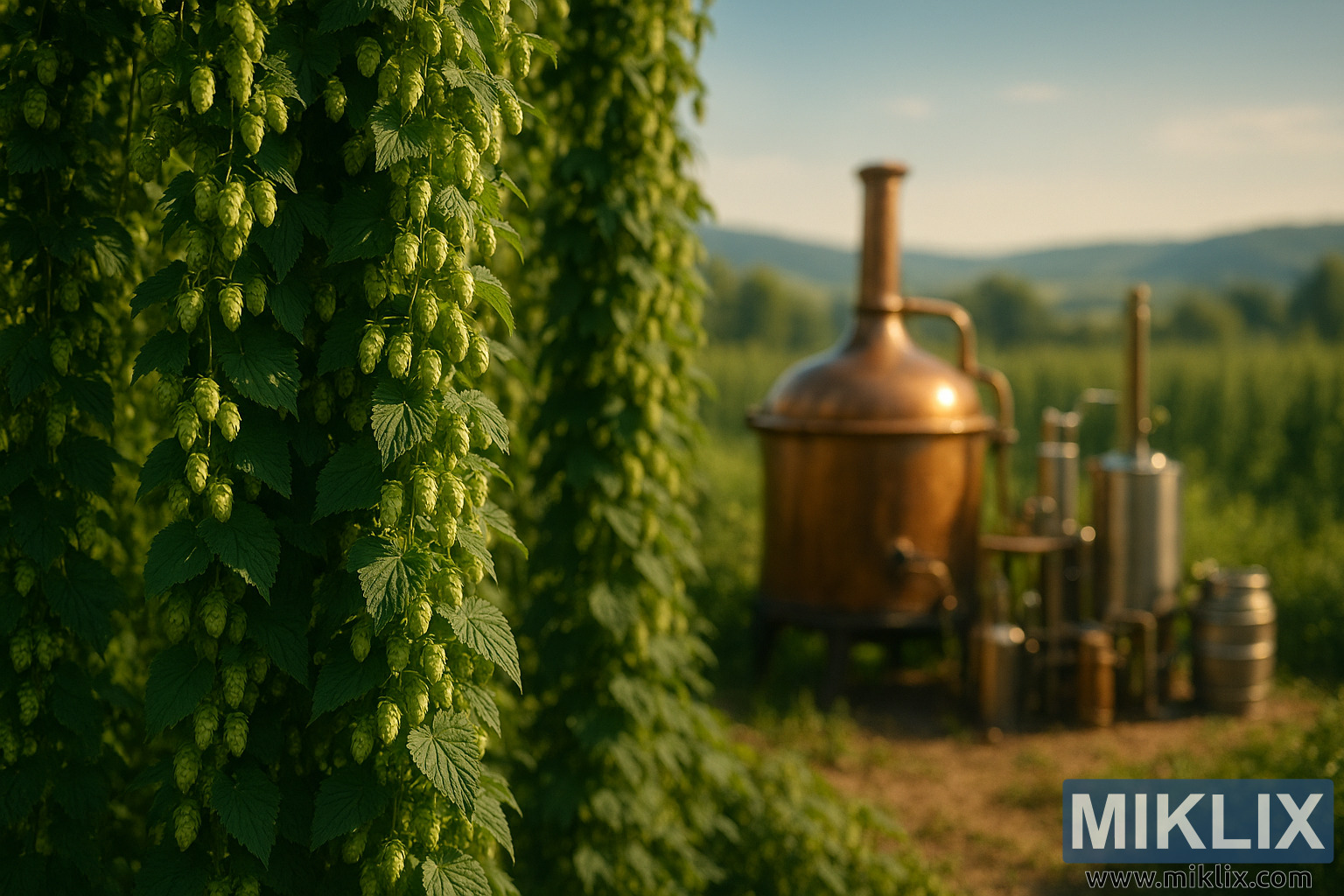 U sredini, smešten među zelenilom, stoji tradicionalni drveni čajnik za pivo sa poliranom bakarnom kupolom i vitkim dimnjakom. Njegova površina blista na suncu, odražavajući okolne nijanse zelene i zlatne. U blizini kotlića nalazi se niz zanatske opreme za varenje: fermentori od nehrđajućeg čelika, mala bure i bakarni cevovodi, a sve je pažljivo raspoređeno da sugeriše aktivan proces piva. Ovi elementi izazivaju osećaj izrade i tradicije, premošćujući poljoprivredni i kulinarski svet.
