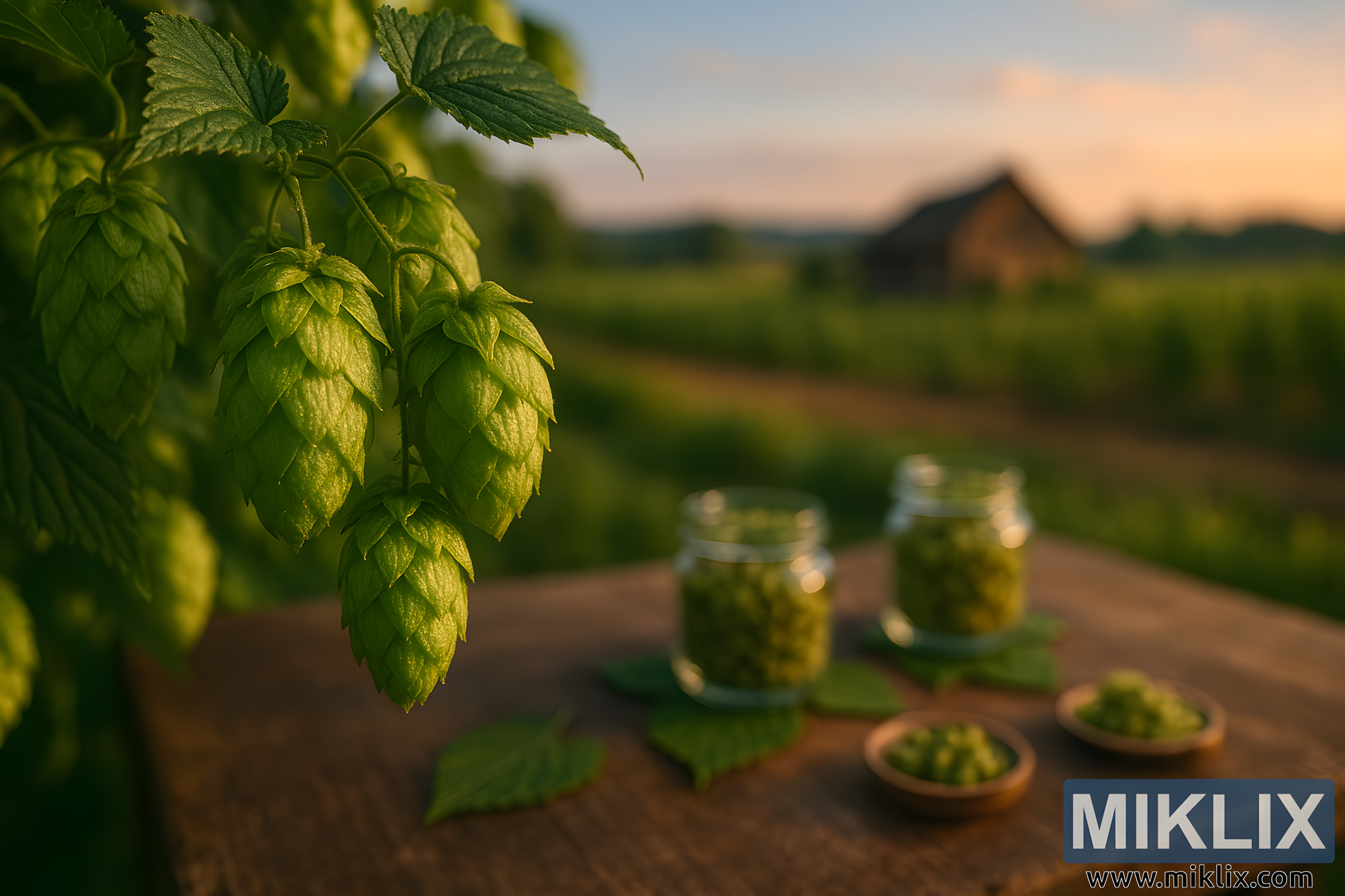 Slika visoke rezolucije Lubelskog hmelja u jutarnjem svetlu, sa svežim češerima, sušenim teglama hmelja i slikovitom pozadinom farme koja evocira zanatsko pivarstvo i lokalnu izradu.