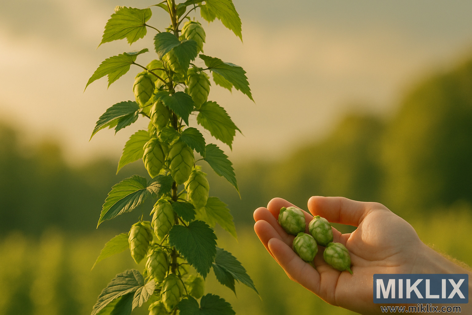 Živahna hmelj bine sa bujnim zelenim šišarkama blista u toplom popodnevnom svetlu kao ruka kolevke sveže iščupanog hmelja. Ova scena zlatnog sata evocira zanat, brigu i čulno obećanje piva sa svežim hmeljem.