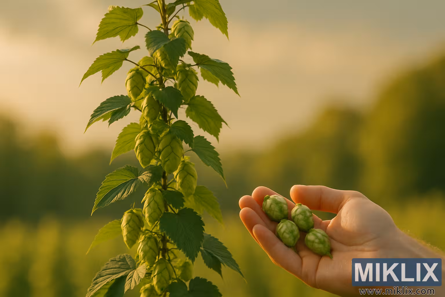 Golden-Hour Hop Bine with Freshly Plucked Cones