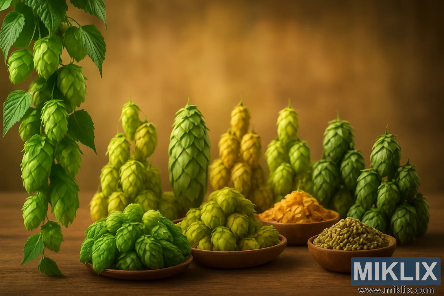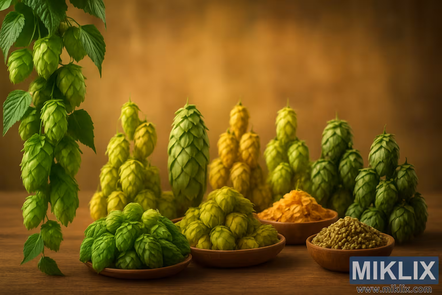 Fotografija predstavlja živu i pažljivo postavljen prikaz sorti hmelja, uređen da istakne i njihove prirodne lepote i njihov značaj u pivu. U prvom planu, bujni zeleni hmelj šišarke kaskadno se spuštaju nadole iz bine, njihovi preklapajući brakteji formiraju zamršene, skalirane obrasce koji suptilno blistaju pod toplim, difuznim osvetljenjem. Šišarke, debele i sveže, privlače neposrednu pažnju svojom živom bojom i delikatnom strukturom, simbolizujući aromatično srce piva. Njihove vitice se graciozno isprepliću, dodajući osećaj organskog pokreta inače mirnoj kompoziciji.