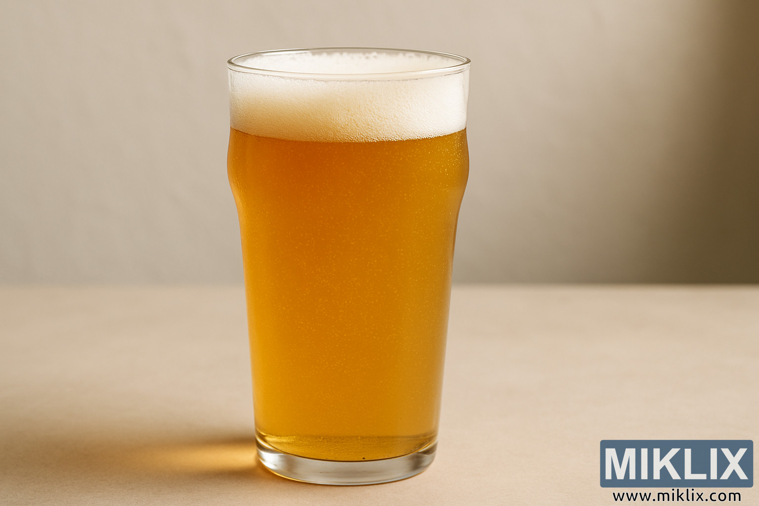 Osvetljenje na slici je nežno i prirodno, baca meke senke ispod stakla dok suptilno osvetljava pivo iz različitih uglova. To rezultira toplim, privlačnim sjajem koji povećava dubinu boje u pivu i naglašava čiste, precizne linije staklenog posuđa. Pozadina je namerno jednostavna, sa blago zamagljenom, neutralnom površinom koja izbegava ometanje i naglašava centralnu temu. Ovo minimalističko okruženje omogućava gledaocu da se u potpunosti fokusira na kvalitet piva i njegovu prezentaciju.