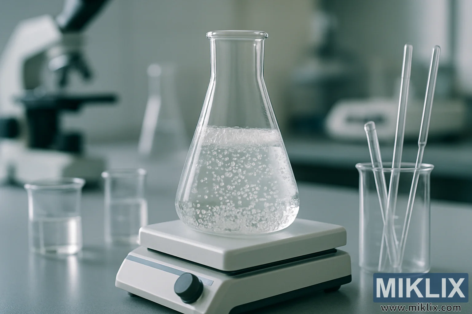 Slika snima detaljnu laboratorijsku scenu, fokusirajući se na centralnu Erlenmeierovu bocu ispunjenu bistrom tečnošću koja aktivno mjehuri na beloj magnetnoj ploči za mešanje. Tečnost je u pokretu, šumeći mehurići se kontinuirano dižu, što ukazuje na proces fermentacije ili hemijsku reakciju u kontrolisanim laboratorijskim uslovima. Jasnoća tečnosti omogućava gledaocu da vidi delikatne tokove mehurića, dok sama staklena boca reflektuje meke naglaske iz okolne difuzne svetlosti. Ove refleksije naglašavaju i glatku površinu boce i njenu transparentnost, skrećući pažnju na suptilnu igru između stakla, tečnosti i svetlosti.