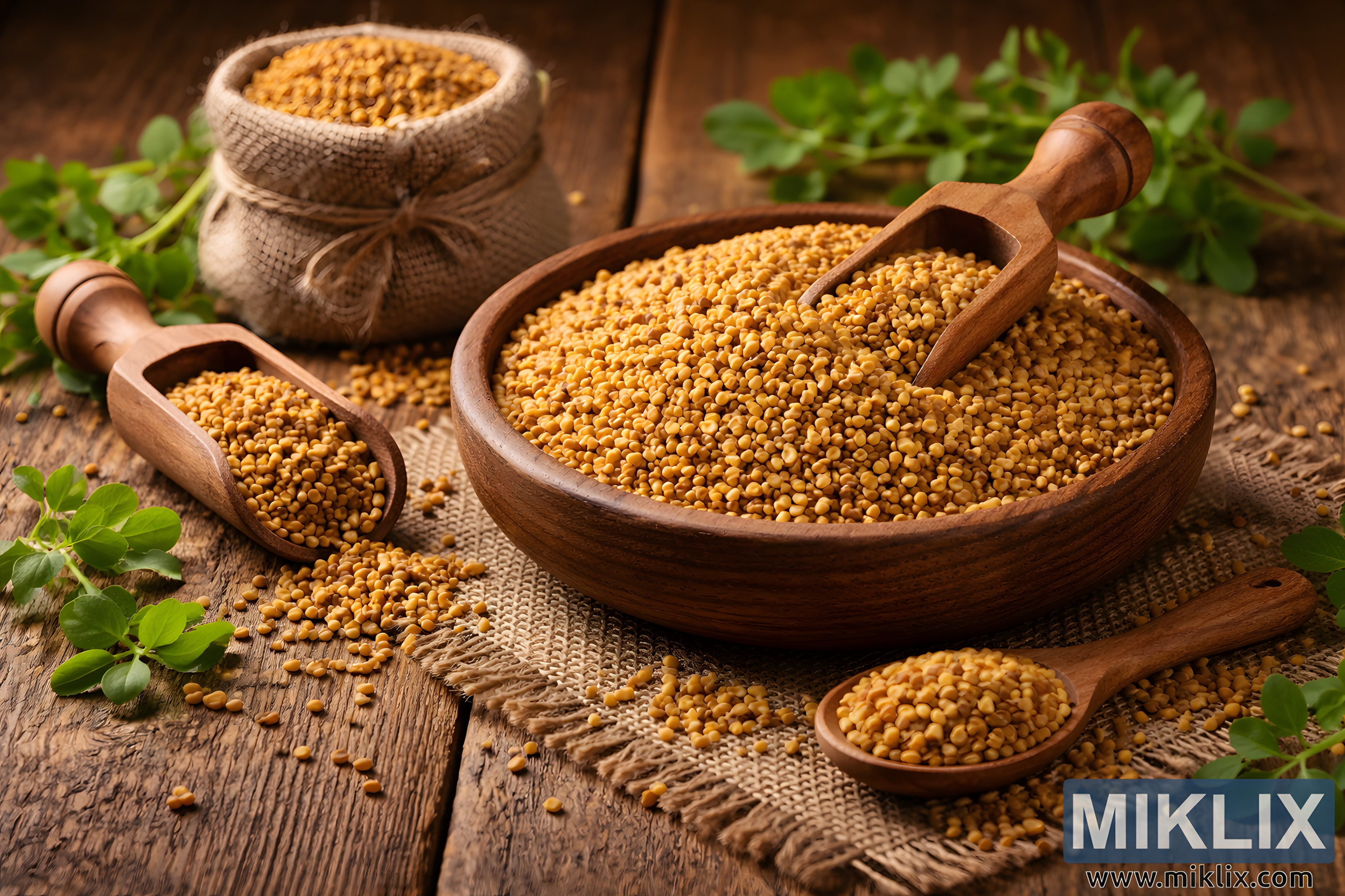 Poto kadaharan désa résolusi luhur tina siki fenugreek disusun dina mangkok kai sareng sendok dina méja kai tékstur nganggo lawon goni sareng daun héjo.