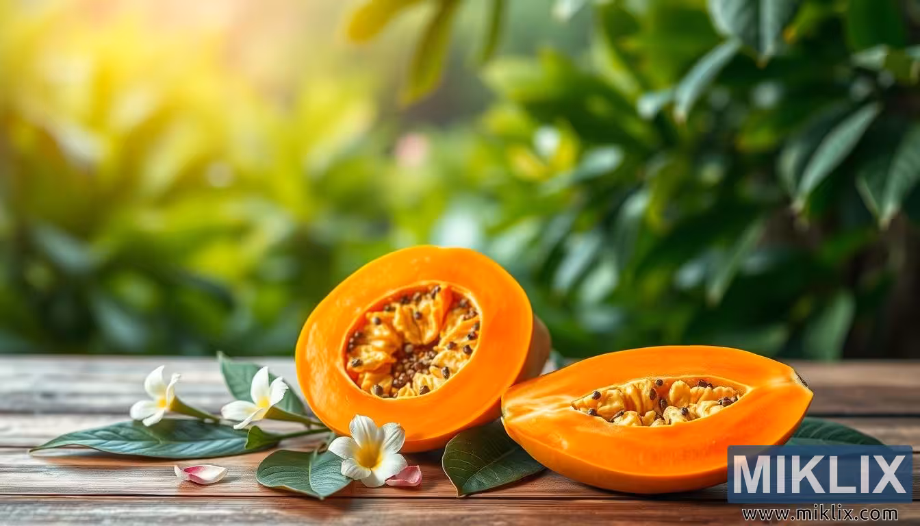 Gambar-resolusi luhur papaya kalayan daging emas juicy dina permukaan kai, dikurilingan ku daun sareng kelopak, ngalambangkeun kesegaran sareng kauntungan anti radang.