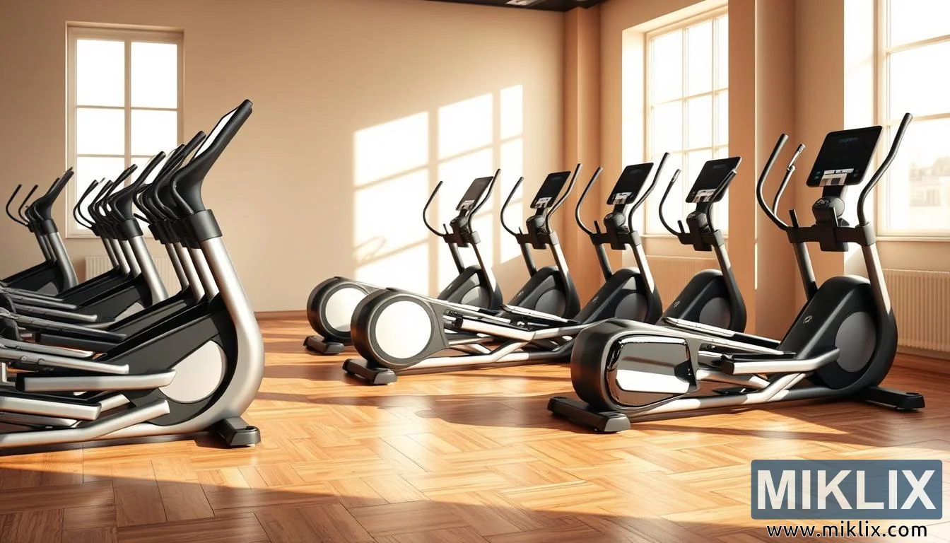 mesin elliptical elegan dina caang, studio kabugaran minimalis jeung floors hardwood, panyorot low-dampak, kauntungan latihan cardio ramah gabungan.