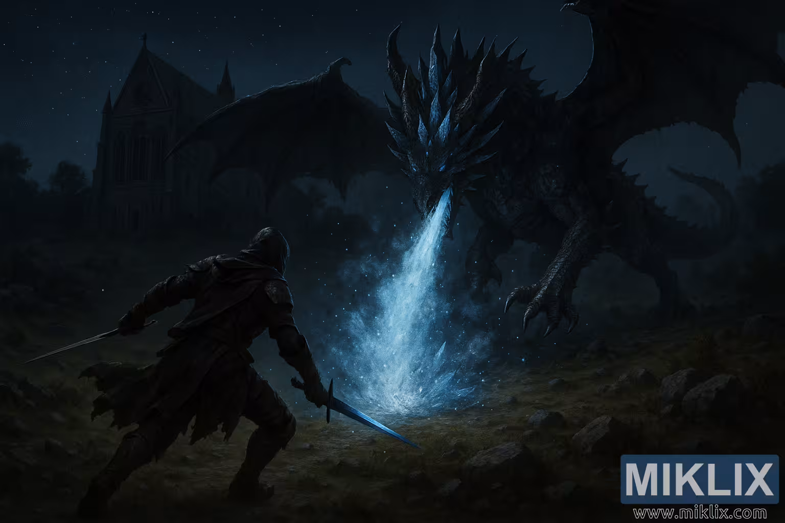 Ilustrasi anu résolusina luhur sareng berorientasi lanskap ieu ngarekam momen tarung aktif ti Elden Ring, anu robah sacara tegas tina konfrontasi statis kana kekacauan perang. Dipidangkeun dina gaya fantasi anu réalistis, adegan ieu disetél di handapeun langit wengi anu tiis sareng pinuh ku béntang anu ngaluarkeun cahaya samar-samar di sakuliah lahan anu kasar caket Katedral Manus Celes. Nada sakabéhna poék sareng sinematik, nekenkeun gerakan, bahaya, sareng ketidakseimbangan anu brutal antara prajurit fana sareng naga kuno.