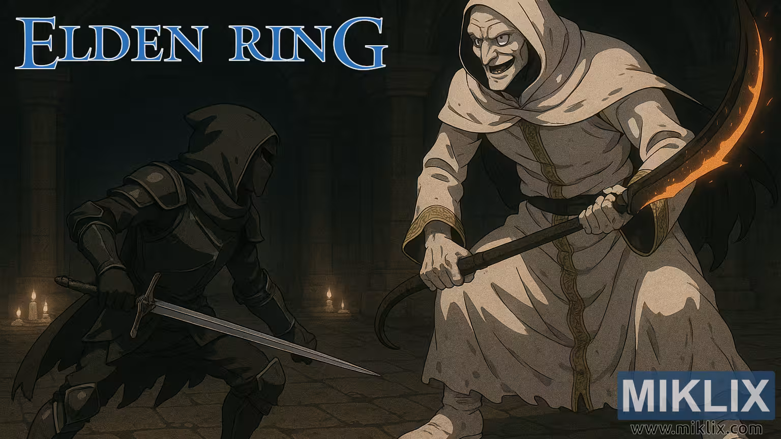 Ilustrasi seni kipas ieu ngarebut konfrontasi anu tegang sareng atmosfir antara rajapati Hideung Knife sareng Rasul Godskin di jero ruangan anu terang-terangan, obor tina Menara Ilahi Caelid, lokasi anu dikenal di Elden Ring pikeun arsitéktur anu oppressive sareng ambience foreboding. Komposisi ngagunakeun framing sinematik anu lega anu nempatkeun duanana karakter dina tampilan pinuh, nekenkeun pasea caket antara siluman sareng fanatisme. Lingkungan sabudeureun éta-pilar batu masif, arches vaulted, sarta kedip-kedip lilin-nyiptakeun setting nu karasaeun kuno, kerung, sarta muatan jeung lingering dread.