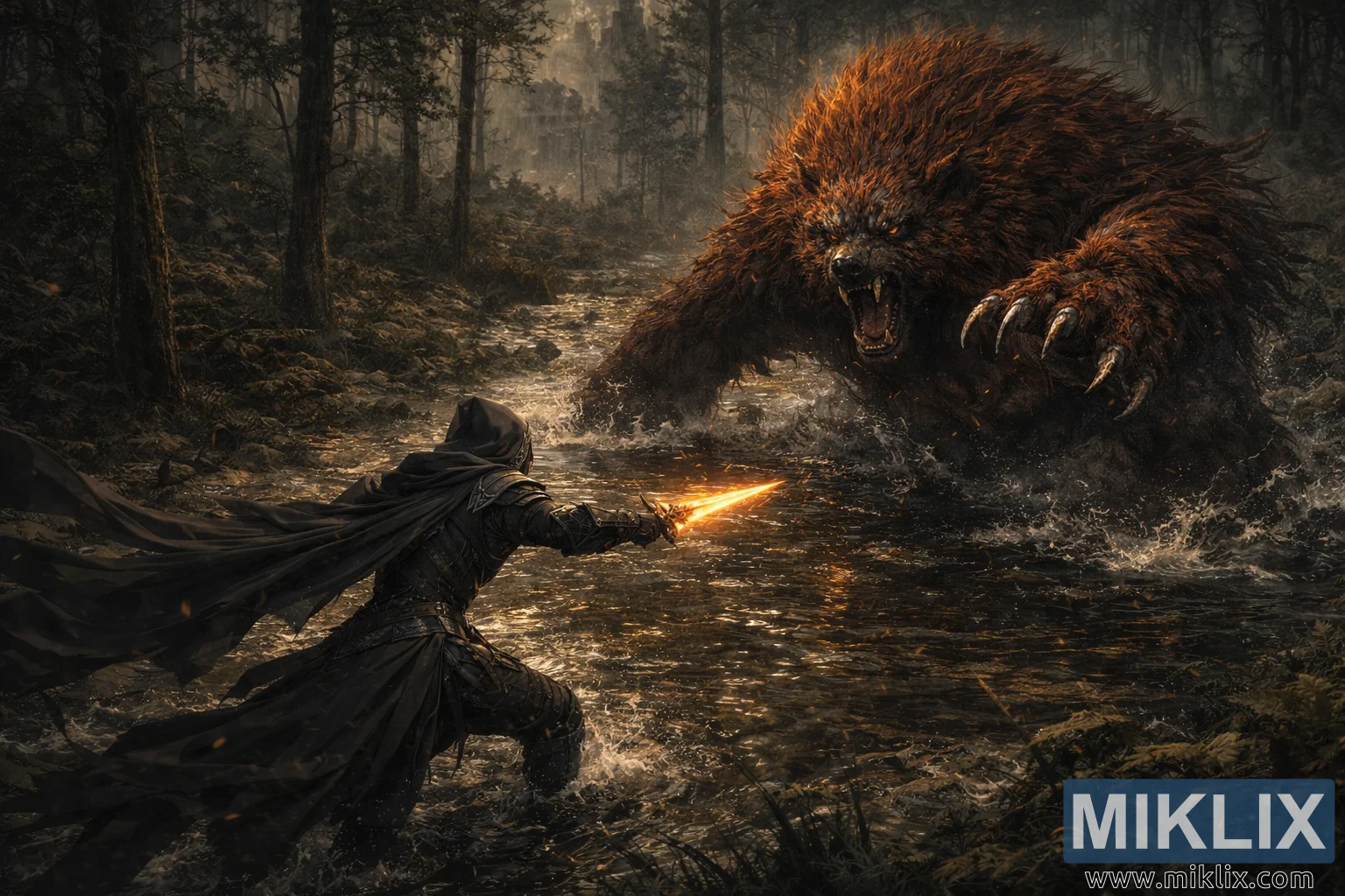 Gambar éta ngagambarkeun konfrontasi anu surem sareng dasar anu dipidangkeun dina gaya fantasi poék anu réalistis, ngajauhan sipat anime anu dilebih-lebihkeun kana nada sinematik anu beurat. Tina sudut pandang anu ditarik ka tukang sareng rada luhur, Tarnished maju ngaliwatan aliran leuweung anu déét, sosokna nempatan kénca handap pigura. Waja Pisau Hideung katingalina beurat sareng usang perang, logamna anu hideung kusam ku kalembaban sareng kokotor, kalayan tatahan pérak anu samar-samar ampir teu katingali di handapeun garis leutak sareng cai. Jubah anu robek nyeret ka tukang, lawon poék baseuh sareng nempel nalika ngaliwat permukaan anu riak.