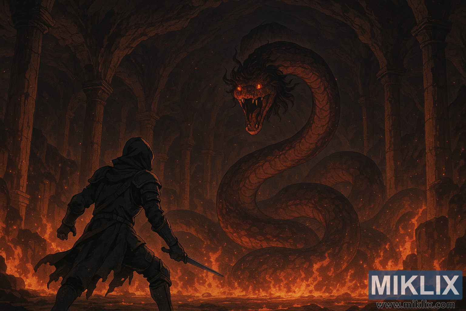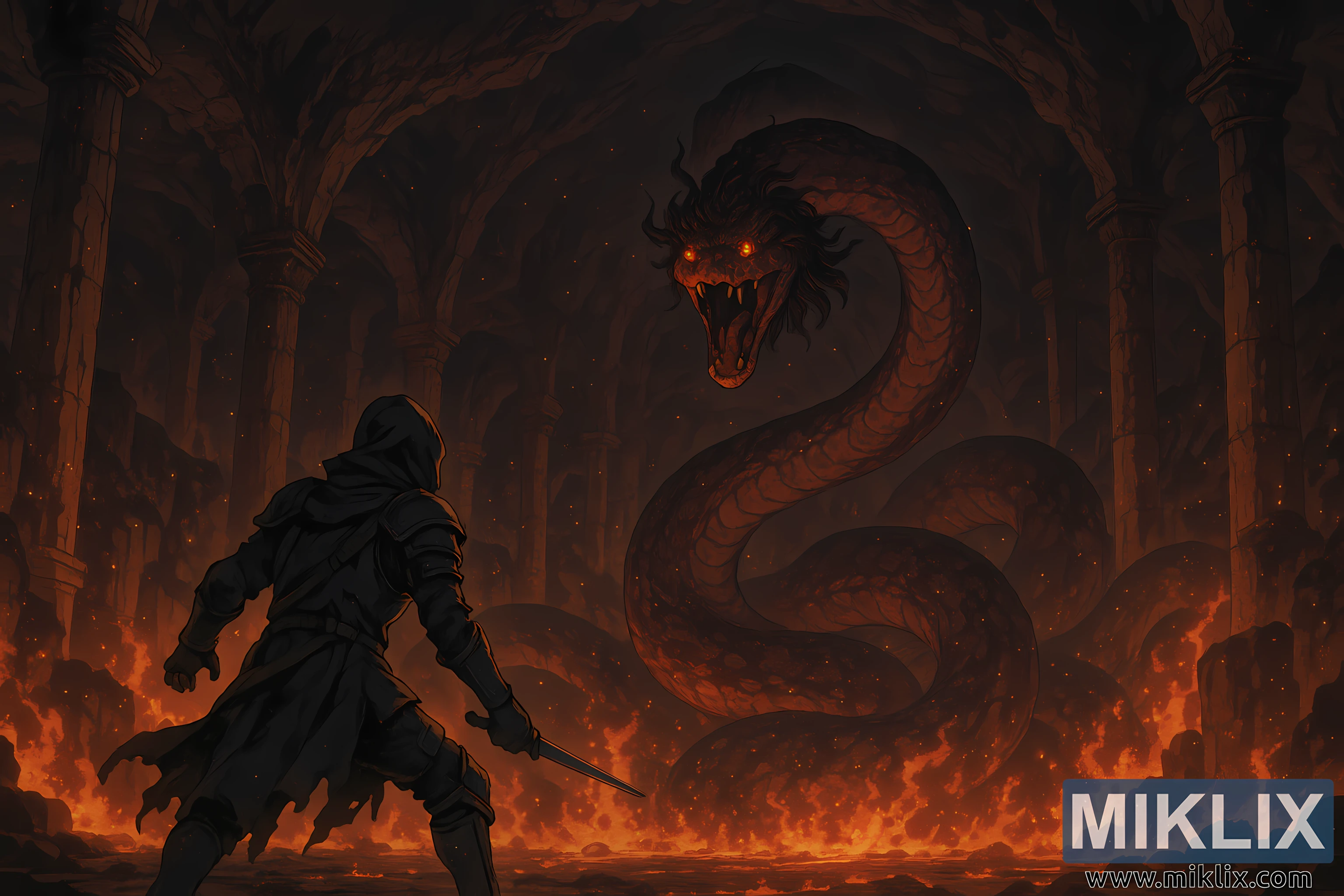Sateuacan anjeunna ngagulung oray kolosal - perwujudan vulkanik anu monstrous tina hatred sareng kakuatan hina. Sato galak naék tina danau seuneu anu ngagelebug jeung nyiduh beureum lebur, gulungan badagna ngagulung kawas akar bengkok dewa kuno. Sisik-sisik oray dipaparinkeun dina nada bercahaya anu ngageser antara layung embered jeung lava-batu blackened, shimmering saolah-olah panas radiated ti unggal inci tina sumputkeun na. Rahangna muka lega, ngalaan fangs kawas tumbak obsidian, sarta panon na kaduruk kawas infernos kembar dikonci kana Tarnished kalawan niat jahat jeung lapar. Gumpalan-gumpalan buuk hangus nempel dina makuta mahluk, ngabengkokkeun ka luhur kawas haseup, ngabingbing raray nu duanana serpentine jeung nightmarishly manusa.