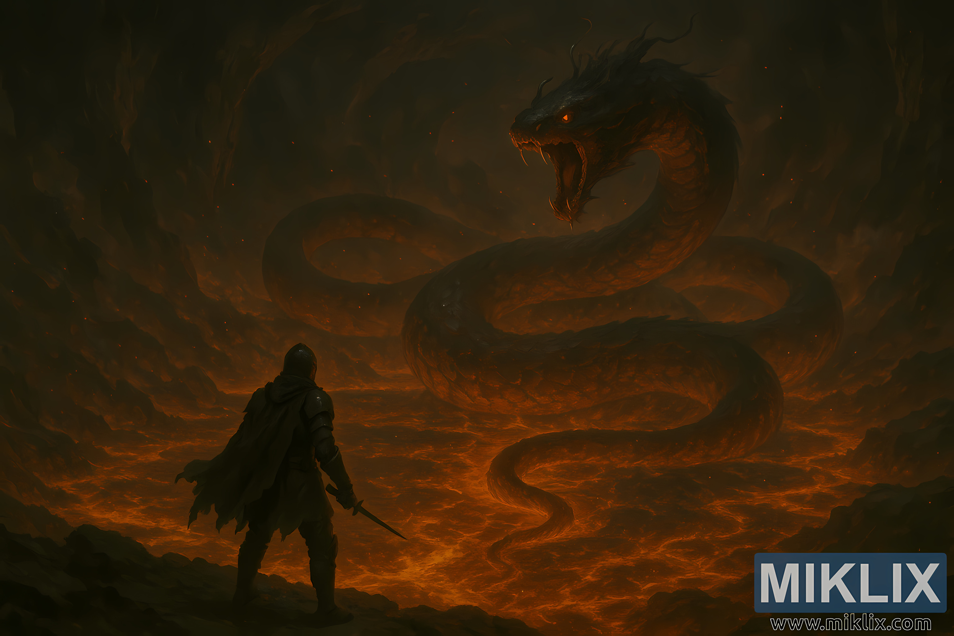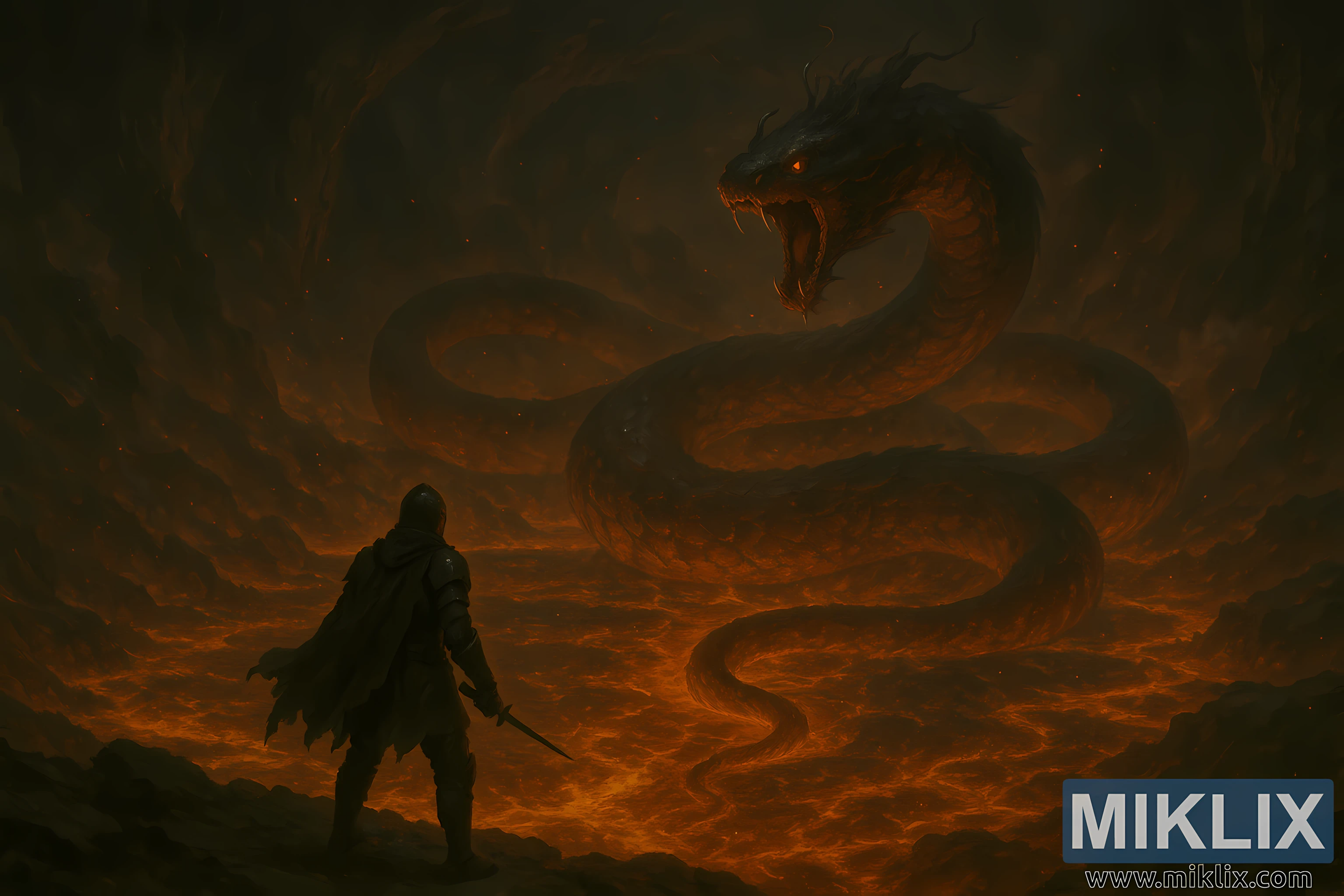 Karya seni ieu nampilkeun pandangan sinematik anu luar biasa tina konfrontasi anu teu mungkin - saurang prajurit Tarnished leutik nangtung nyalira sateuacan oray skala gunung di jero guha vulkanik. Kaméra diluhurkeun sareng ditarik ka tukang, ngagentos panuduh kana tempat anu saé, ningkatkeun kaagungan dunya bawah tanah. Ti dieu pamandangan karasaeun observasi, ampir mitos: sakedapan beku di ujung musnah.
