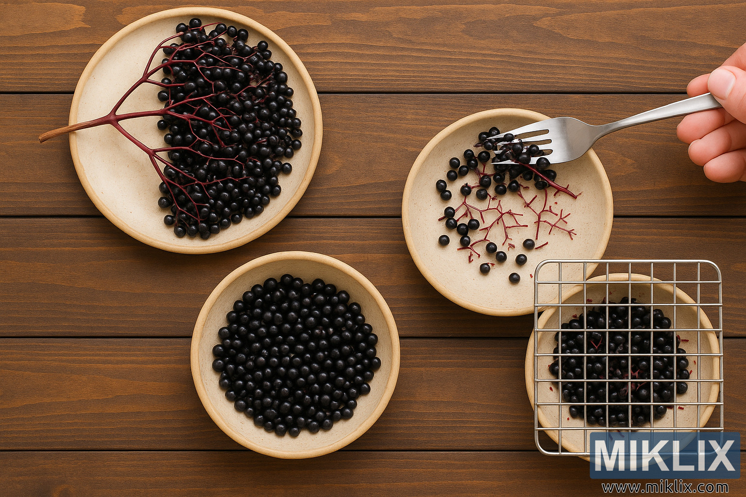 Poto lengkep nunjukkeun tilu metode umum pikeun nyabut elderberry tina batangna: ngaleupaskeun leungeun, nganggo garpu, sareng mencét kana rak kawat, sadayana disusun rapi dina permukaan kai.