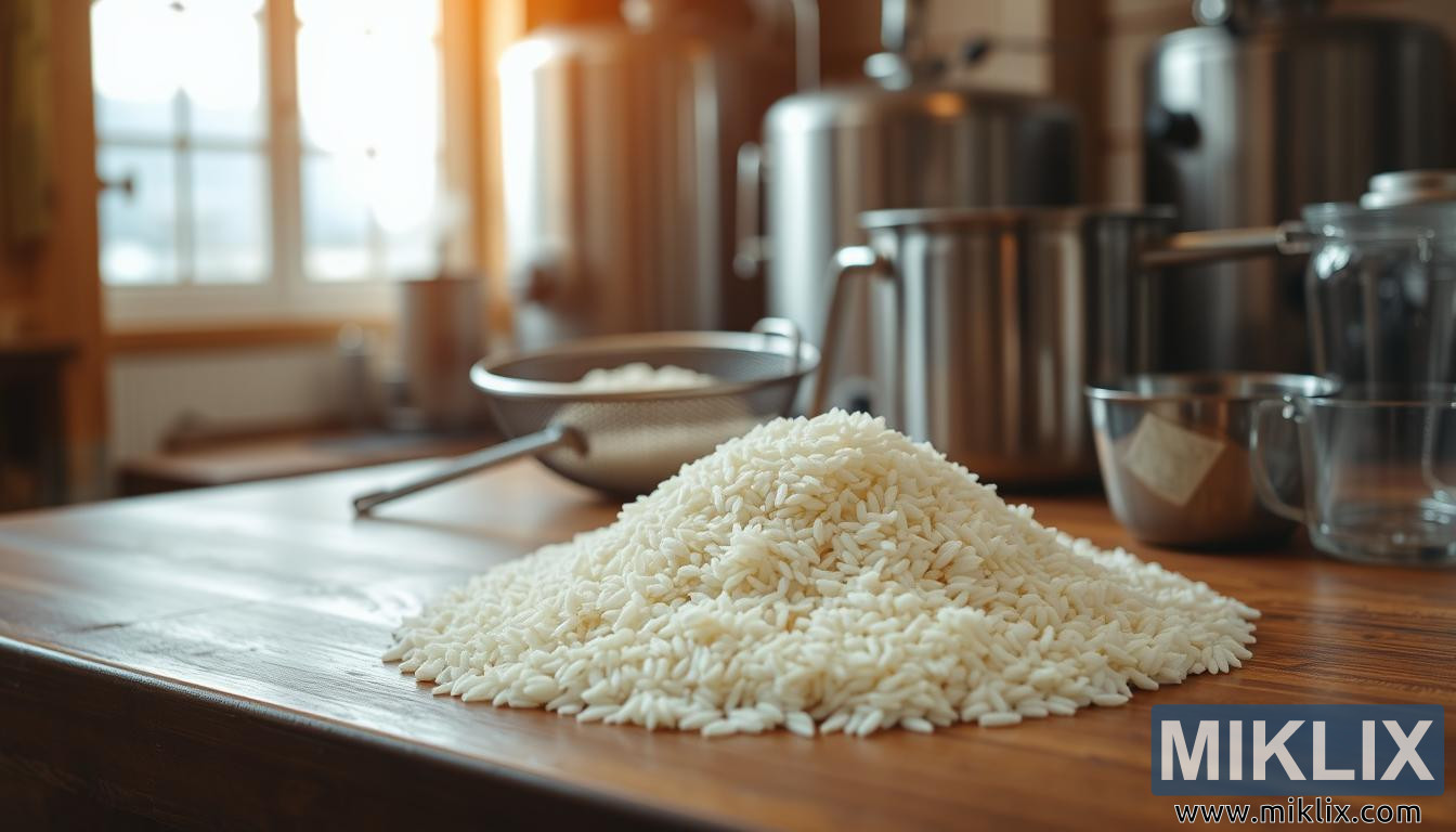 Bathed dina glow lemes tina cahaya alami ngalir ngaliwatan jandela caket dieu, gambar ngarebut momen persiapan sepi di dapur atawa workspace brewing. Titik fokus nyaéta méja kai anu ageung, permukaanna mulus beunghar ku nada anu haneut sareng pola sisikian anu halus anu nyababkeun rasa karajinan rustic. Di tengah méja aya mangkok deet dieusi sangu bodas anu teu asak. Kernelna murni sareng seragam, warna mutiarana nyerep cahaya sareng berkilauan kalayan cahaya anu lembut. Unggal sisikian némbongan sacara saksama dipilih, nunjukkeun henteu ngan ukur kuliner tapi tujuan anu langkung jero - sigana awal prosés nyéépkeun dimana sangu maénkeun peran anu penting dina ngabentuk produk ahir.