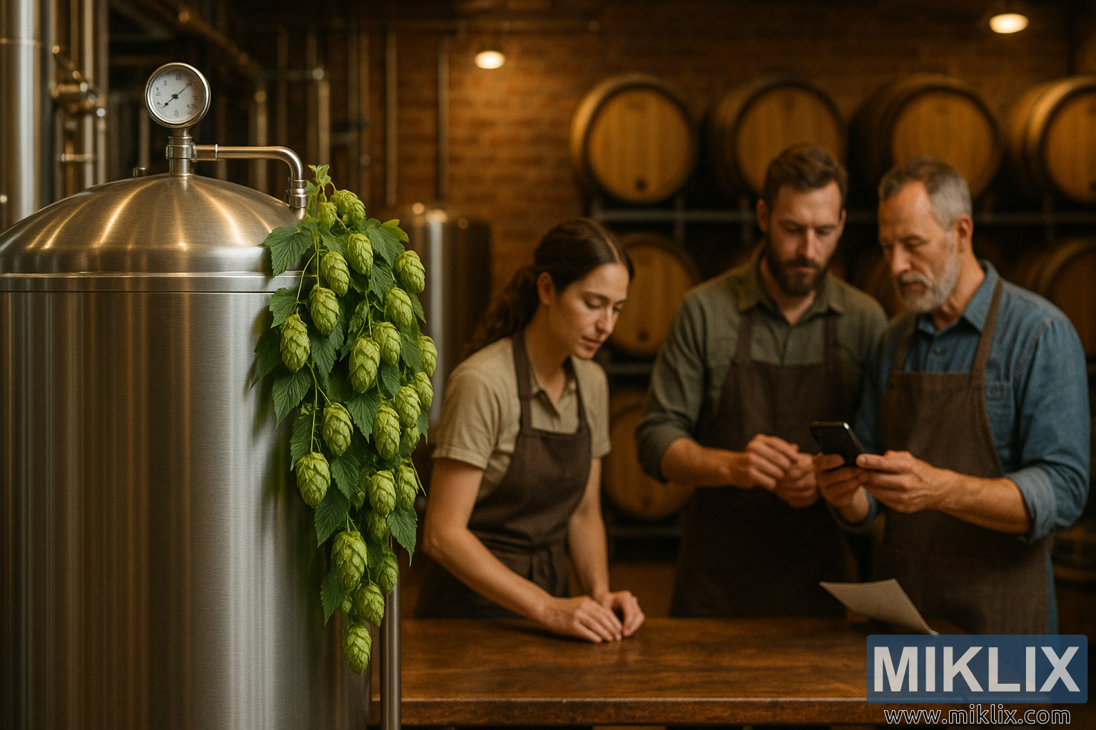 A interior brewery kalawan tank fermenting baja draped di hops, brewers di gawe, sarta tong ek ngajajar témbok dina cahaya haneut.