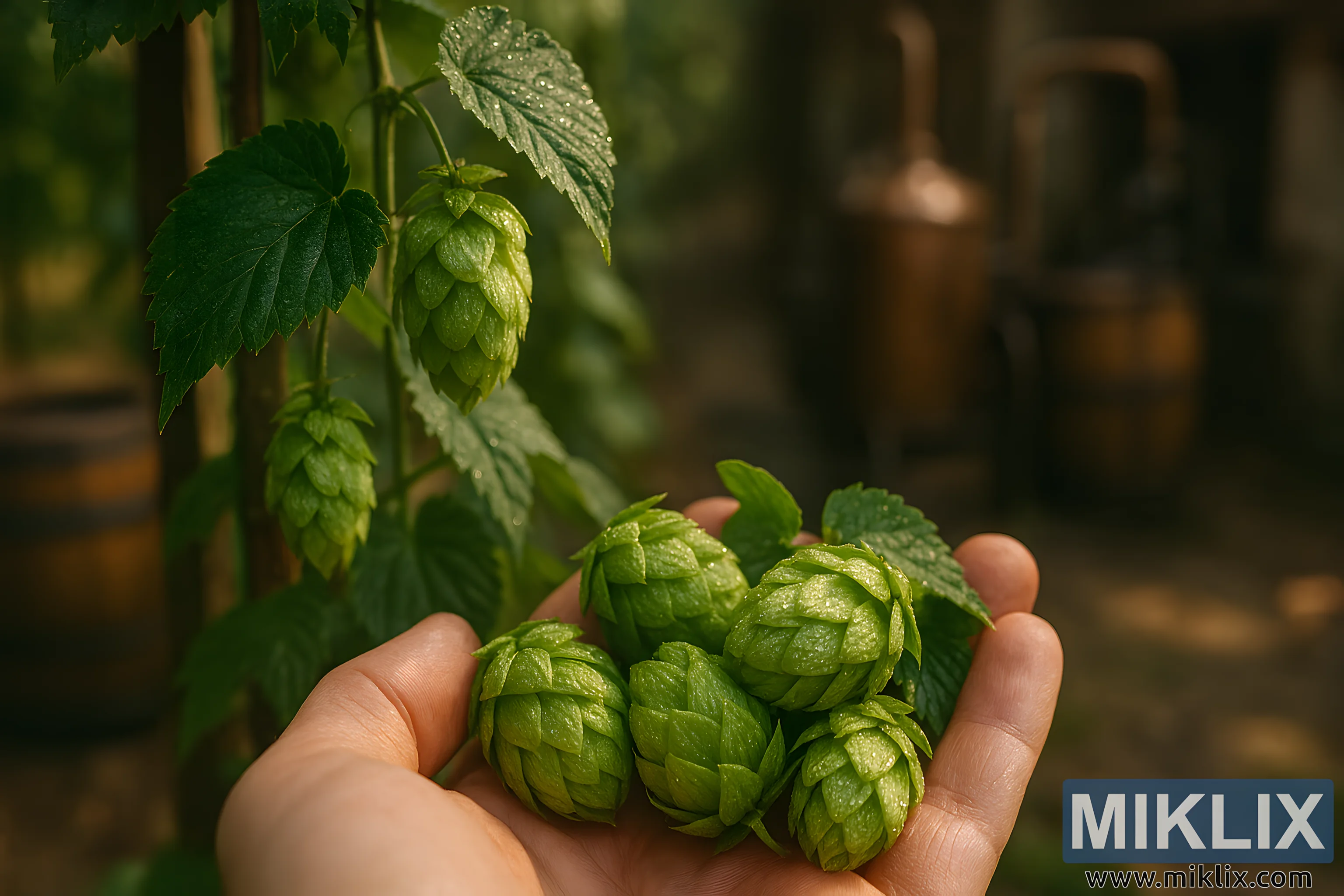 Poto bentang alam résolusi luhur ieu néwak inti tina nyieun bir artisanal ngaliwatan pandangan caket tina hop Backa anu nembé dipanén. Di latar hareup, leungeun anu warnana hampang ngagelenyu sakeupeul kerucut hop héjo anu cerah, masing-masing dilapis ku sisik anu tumpang tindih. Kerucutna berkilauan ku embun isuk-isuk, téksturna anu lemes disinari ku sinar panonpoé anu lemes sareng alami. Kelengkungan leungeun anu halus sareng cekelan anu santai nekenkeun hubungan organik antara patani sareng pepelakan, nguatkeun réalisme taktil gambar.