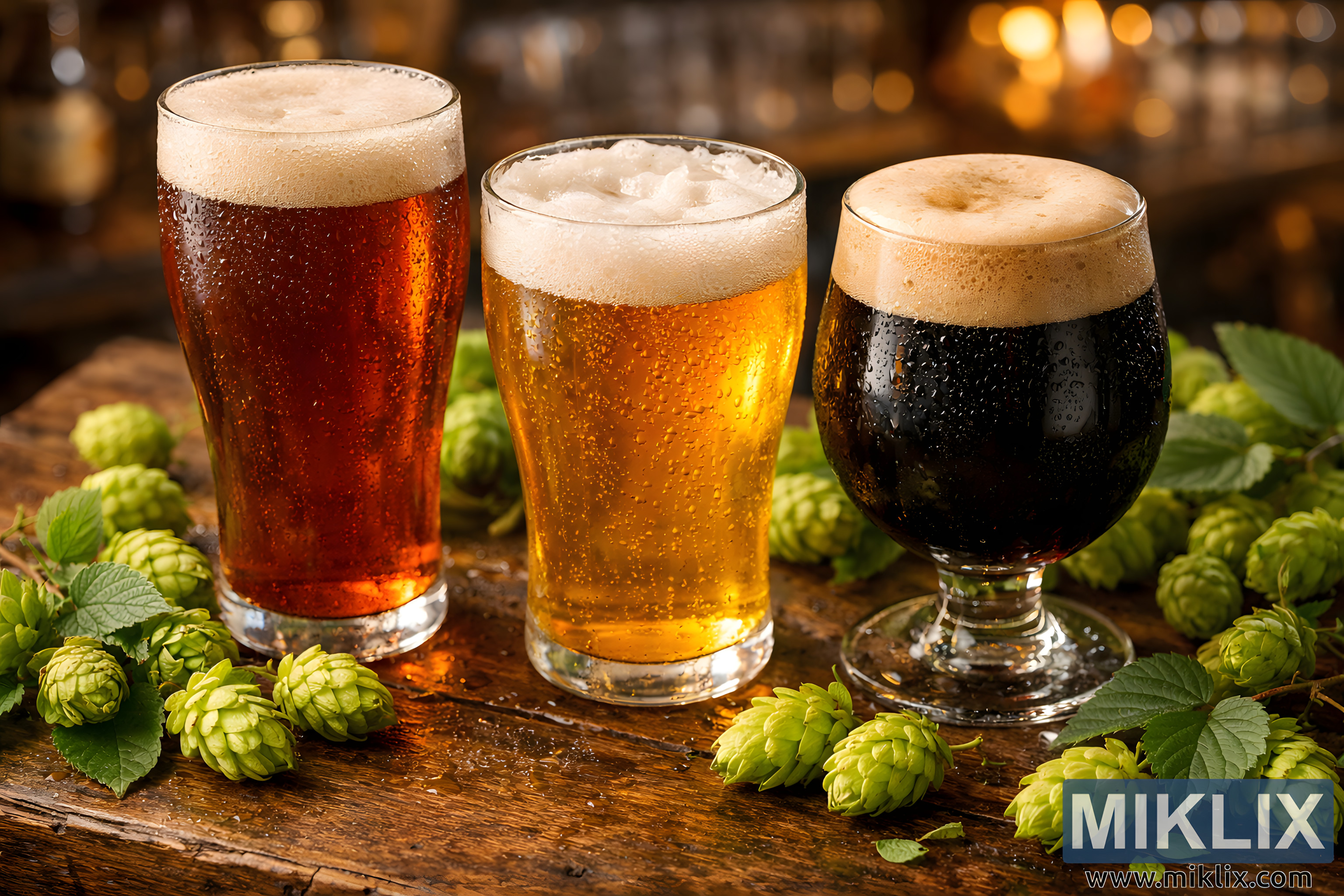 Poto jarak deukeut anu nyaman tina tilu jinis bir dina méja kai désa—lager amber, ale pucet emas, sareng stout poék—dikurilingan ku cone hop héjo seger sareng lampu bar anu haneut sareng samar-samar.