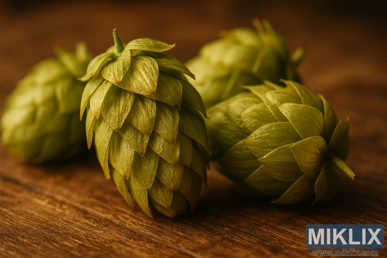 Beungeut kai handapeun hops nyumbangkeun hiji euyeub, nada earthy kana skéma warna sakabéh. Warna coklat haneut na ngalengkepan héjo hops sareng sacara visual nguatkeun hakekat tatanén anu alami. Sikian kai ngalir sacara horisontal meuntas gambar, garis-garis halus sareng alur halus sacara lembut ngarah panon ngalangkungan pigura. Kilauan saeutik tina kai nunjukkeun permukaan anu digosok sareng awét - sigana jinis méja atanapi papan anu dianggo dina lingkungan pembuatan bir tradisional - anu nyababkeun atmosfir rustic, berorientasi kana karajinan.