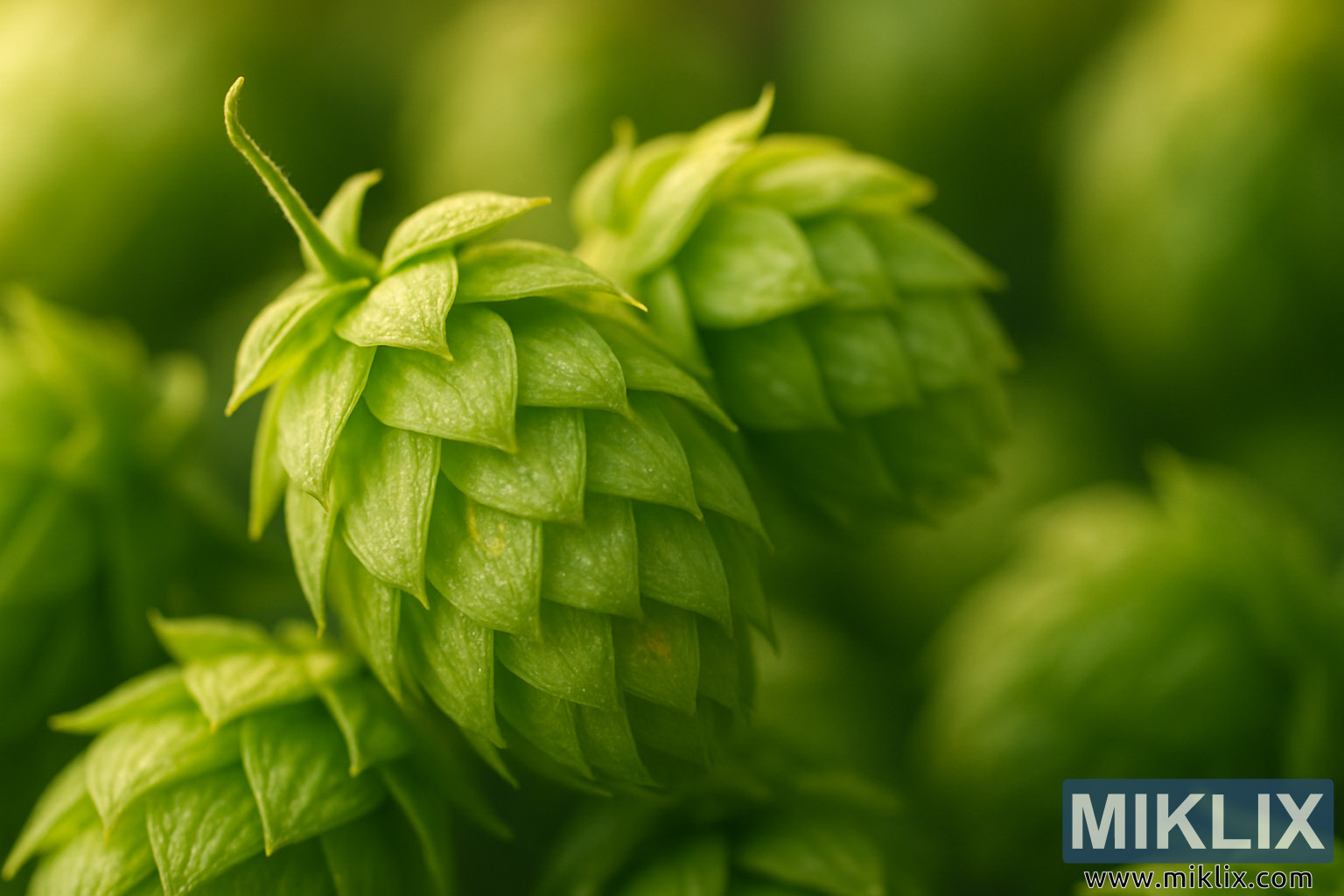 Jero widang deet ngasah congcot di tengah pigura, sahingga unggal ujung hipu pikeun nangtung kaluar dina relief seukeut, bari tukang leyur jadi blur lemes tina héjo. Isolasi visual ieu ngajadikeun subjek ngarasa langsung tur hirup, saolah-olah nu ningali bisa ngahontal kaluar jeung sikat ramo maranéhanana sapanjang petals rapuh tina hop nu. Latar anu kabur, diwangun ku congcot anu sanés dina tahapan fokus anu béda-béda, nyiptakeun rasa kalimpahan sareng kasuburan, nyababkeun ideu halaman hop anu mekar nalika panen puncak. Kasaimbangan fokus jeung blur nyadiakeun kualitas painterly, suggesting teu ngan ulikan ilmiah tutuwuhan, tapi hiji hajatan artistik bentuk jeung fungsi na.