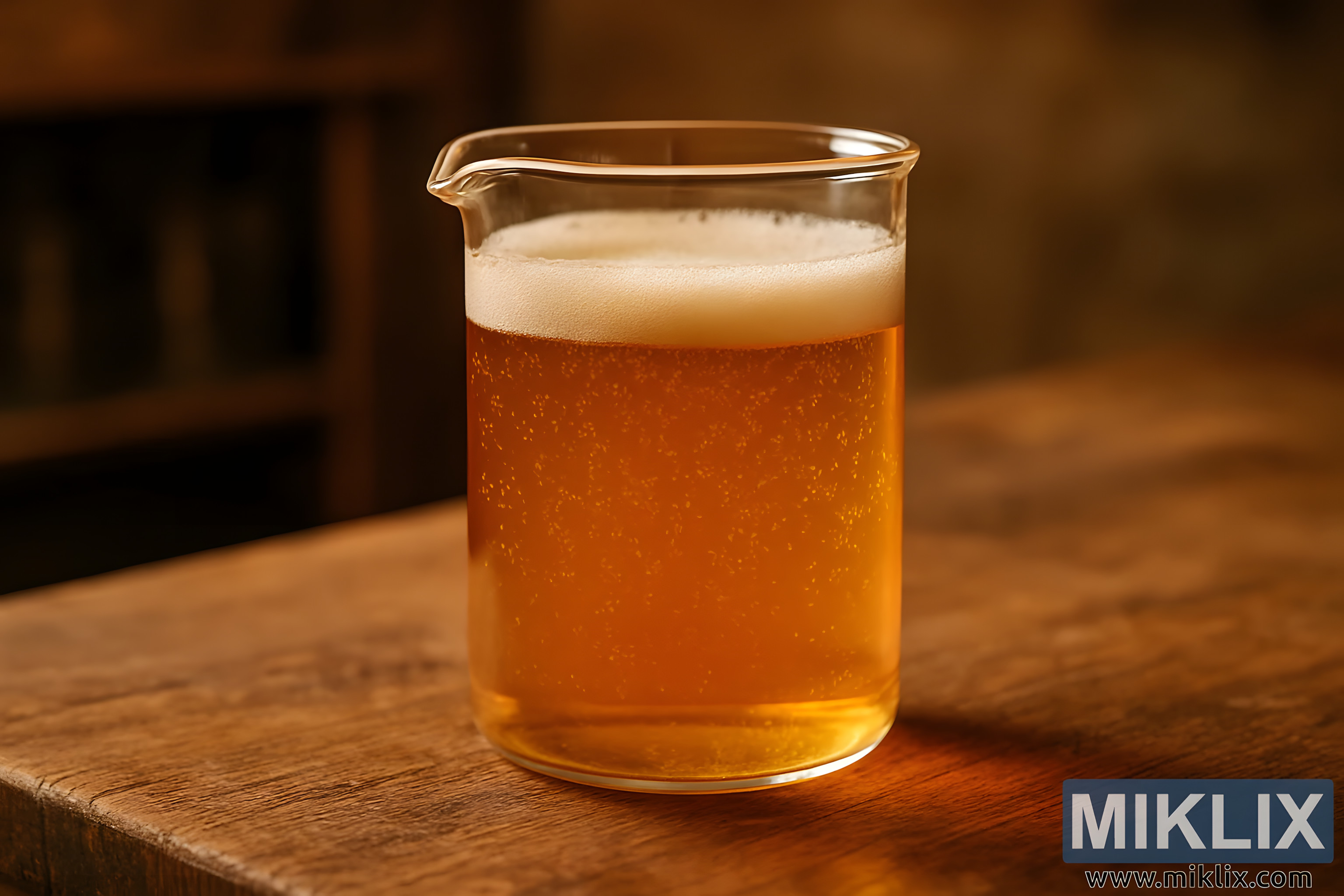 Gambar éta ngagambarkeun pamandangan pembuatan bir anu rustic, dipuseurkeun kana gelas gelas transparan anu dieusi ku cairan effervescent emas. Beristirahat dina beungeut kai warmly toned, beaker nangtung kaluar salaku subjek fokus, exuding duanana precision ilmiah sarta pesona artisanal. Bentuk silinderna jelas sareng teu dihias, henteu aya skala ukur atanapi tanda, anu nekenkeun kamurnian sareng kesederhanaan cairan bir éta sorangan.