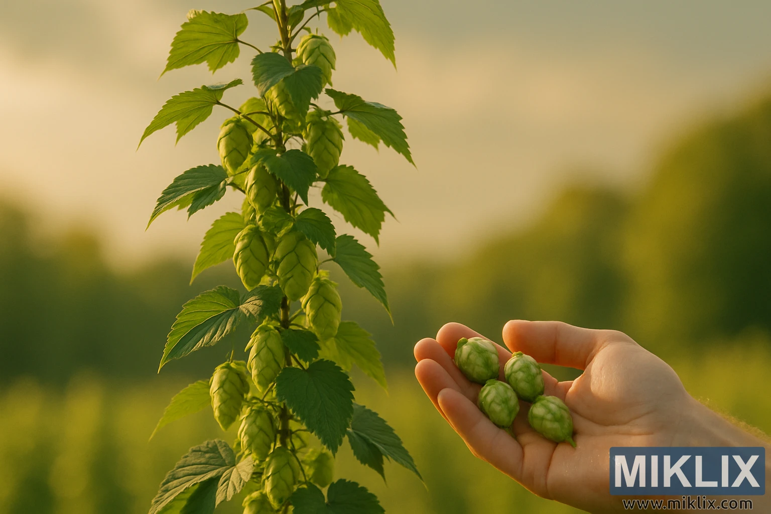 A bine hop vibrant kalawan congcot héjo subur herang dina cahaya soré haneut sakumaha leungeun cradles hop anyar dipetik. Adegan jam emas ieu nyababkeun karajinan, perawatan, sareng janji indrawi pikeun nyéépkeun hops seger.