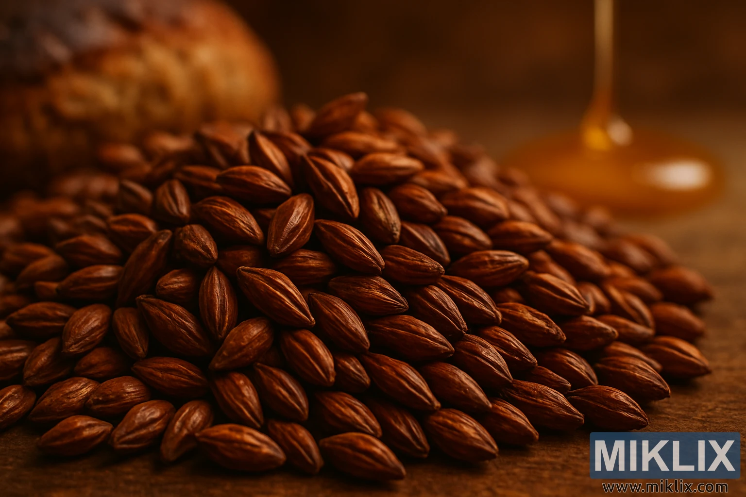 Dimandian ku cahaya keemasan anu lembut, gambar nampilkeun tékstur anu caket tina melanoidin malt, sisikian khusus anu dipuja di dunya pembuatan bir pikeun kamampuanana pikeun masihan jero, warna, sareng profil rasa anu khas pikeun bir. Kernel malt ngadominasi latar hareup, disusun dina tumpukan kerucut anu naék tina permukaan kai rustic. Unggal kernel téh almond-ngawangun, kalawan exterior lemes, rada herang nu nyekel cahaya tur nembongkeun spéktrum kelir beureum saulas-coklat-tina chestnut haneut nepi ka mahoni jero. Pencahayaan, hipu jeung arah, ngaronjatkeun tékstur toasted tina séréal, emphasizing karakter Anggang maranéhanana jeung variasi halus dina warna nu hint di pajeulitna rasa maranéhanana.
