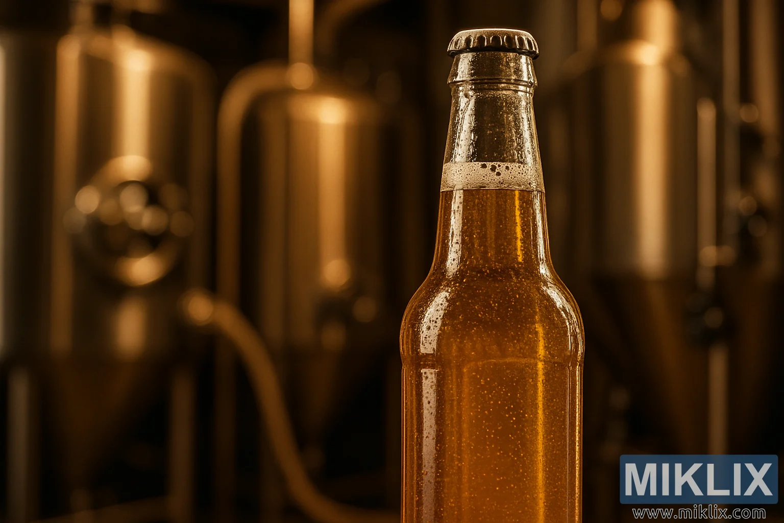 Latar nyadiakeun konteks compelling acan unobtrusive. Dihasilkeun dina kabur bokeh anu lembut, nunjukkeun jero lapangan anu deet anu tetep fokus kana botol. Sanajan kabur, wangun lingkungan brewing téh discernible: jangkung, cylindrical tanghi fermentasi stainless steel naek vertikal di tukang, surfaces logam maranéhanana reflecting lampu emas sarua dina gradién lemes. Sababaraha tanghi gaduh palabuhan aksés sirkular anu katingali sareng kelengkapan klep anu glint sacara halus. Arcing antara tank ieu téh hoses fléksibel, kurva lemes maranéhna nambahkeun rasa lembut gerak ka pamandangan industri disebutkeun masih. hoses ieu ngaleungit kana blur tukang, rinci maranéhna softened pikeun ngajaga fokus visual dina botol.