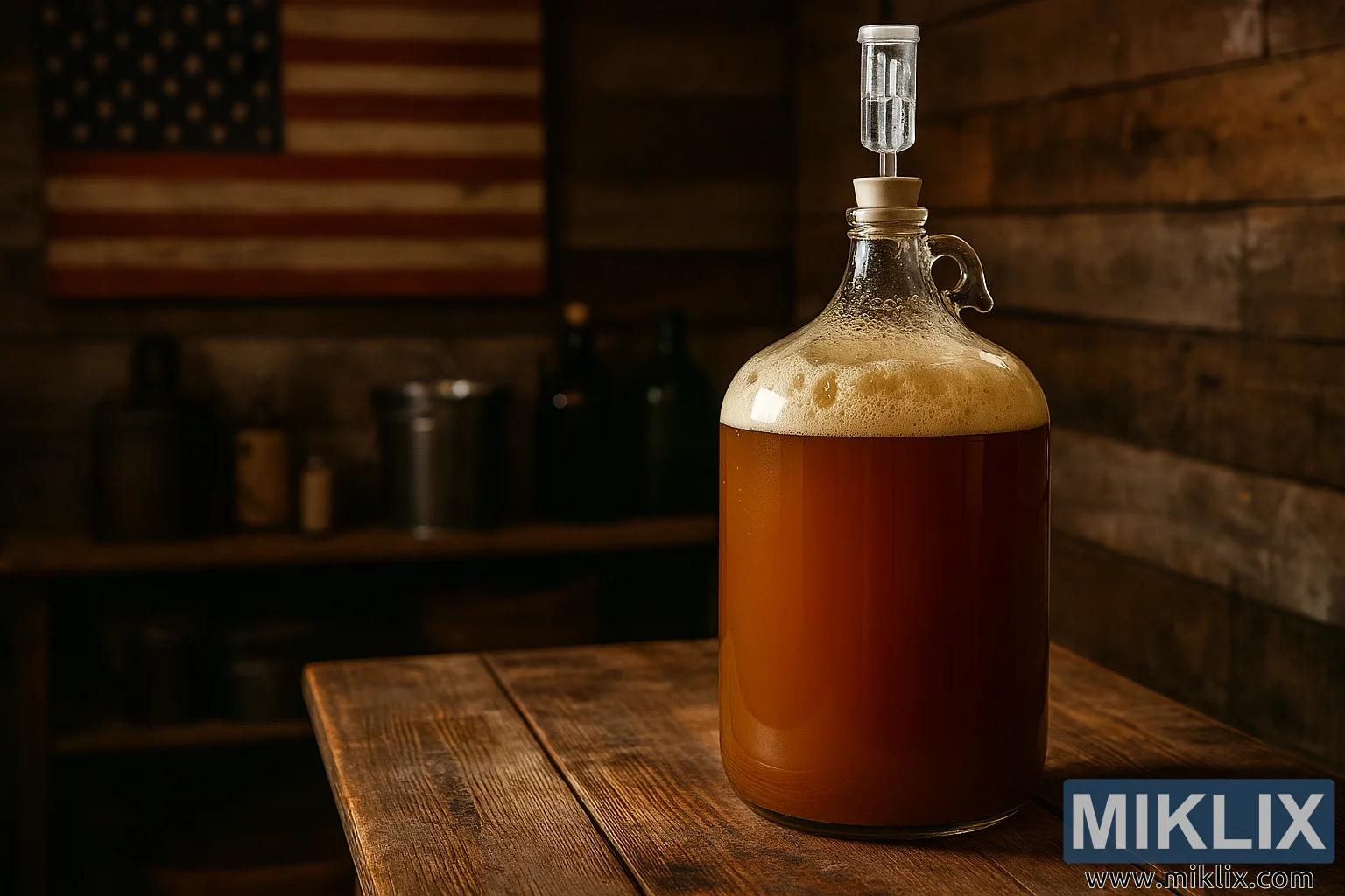 Gambar resolusi luhur ale Amérika fermentasi dina carboy kaca dina méja kai rustic, diatur dina lingkungan homebrew tradisional kalayan cahaya haneut tur decor vintage.