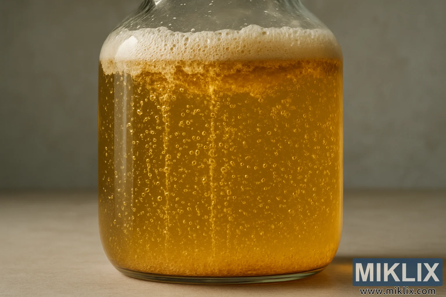 Gambar ieu ngarebut momen transformasi sepi dina prosés pembuatan bir, dimana biologi sareng karajinan ngahiji dina hiji pigura anu elegan. Di tengahna aya wadah kaca transparan, ngeusi cairan warna emas anu bersinar haneut dina lampu arah anu lemes. Kajelasan kaca ngamungkinkeun tempoan anu teu kahalang tina interior cair, dimana gelembung-gelembung leutik anu teu kaétang naék dina aliran anu ajeg ti handap, ngabentuk makuta busa anu hipu dina beungeut cai. Gelembung-gelembung ieu, ngagurilap nalika naék, mangrupikeun napas anu katingali tina fermentasi-karbon dioksida anu dikaluarkeun ku sél ragi nalika ngametabolisme gula janten sanyawa alkohol sareng rasa. Effervescence téh meriah tapi dikawasa, suggesting a cageur, fermentasi aktip disetir ku Mangrove Jack urang M84 Bohemian Lager Ragi.