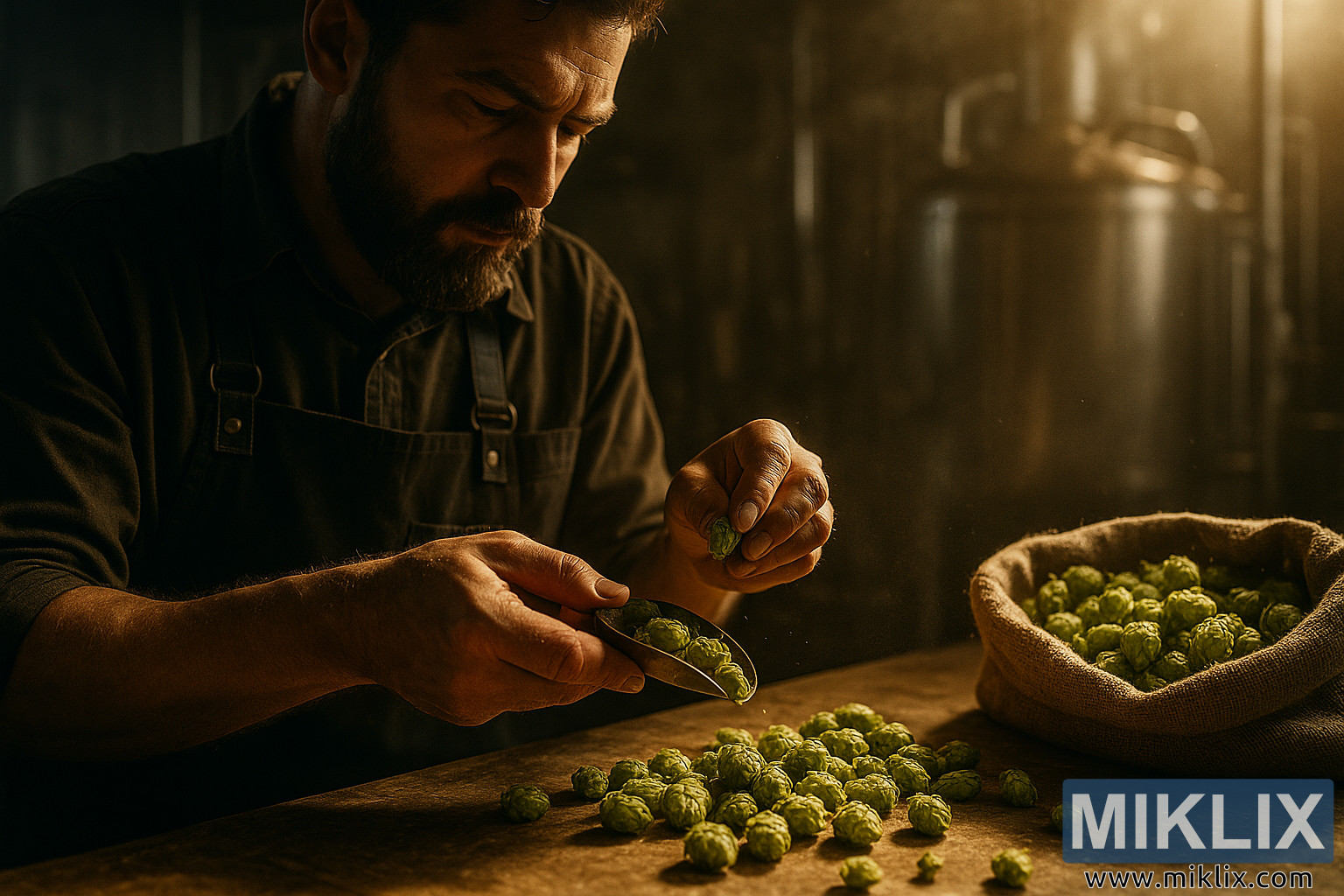 Master Brewer at Work with Bullion Hops in Golden Light