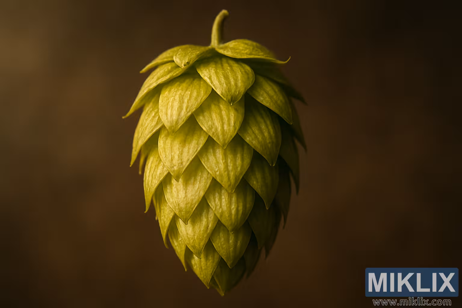 Sammantaget förmedlar kompositionen både vetenskaplig precision och konstnärlig värme. Varje element – från det oklanderliga fokuset på humlekottens lagerstruktur till den noggrant kontrollerade ljussättningen och färgharmonin – arbetar tillsammans för att framhäva humlen som ett objekt av skönhet och betydelse. Fotografiet fångar inte bara humlekottens fysiska utseende utan hyllar också dess roll som en viktig ingrediens i ölbryggning, och förkroppsligar det hantverk och den naturliga komplexitet som Equinox-humlen representerar.